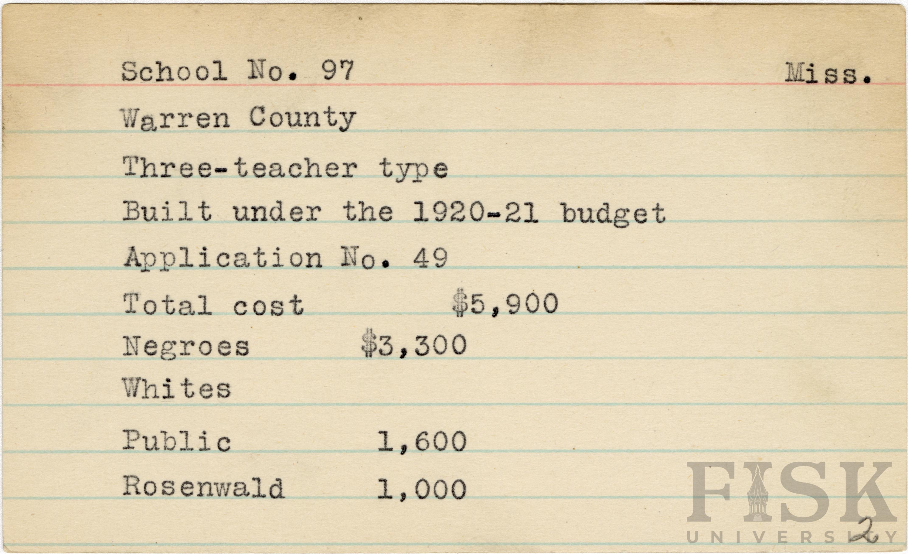 - School card from Rosenwald Fund for School No. 97 in Warren County, Mississippi