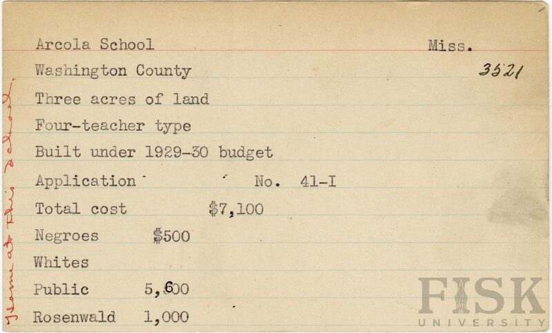 - School card from Rosenwald Fund for Arcola School in Washington County, Mississippi with a handwritten note on the far left of the card that says, "home at this school"