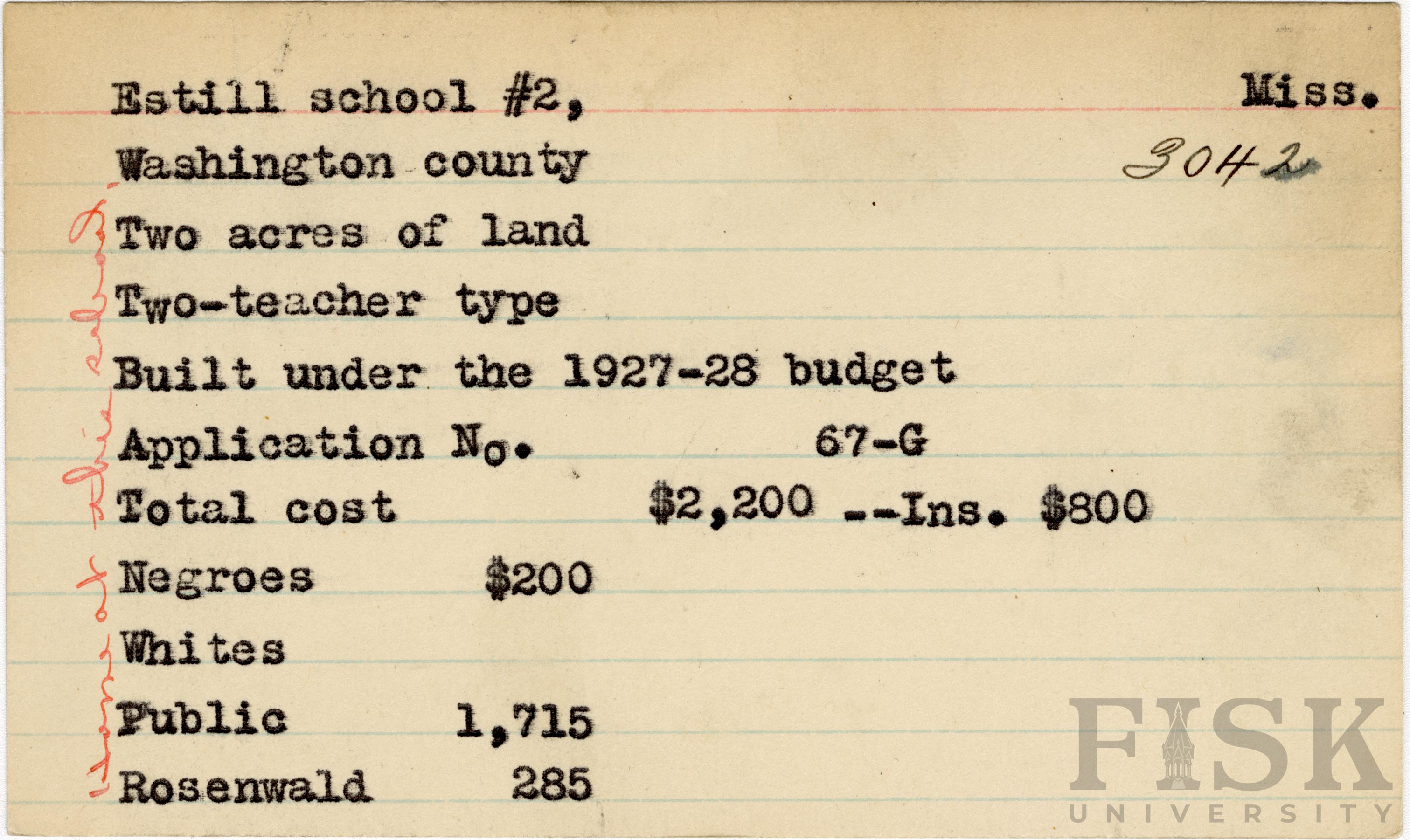 - School card from Rosenwald Fund for Estill School No. 2 in Washington County, Mississippi with a section added to the budget contributions that says, "Ins. $800". A handwritten note on the far left of the card that says, "home at this school"
