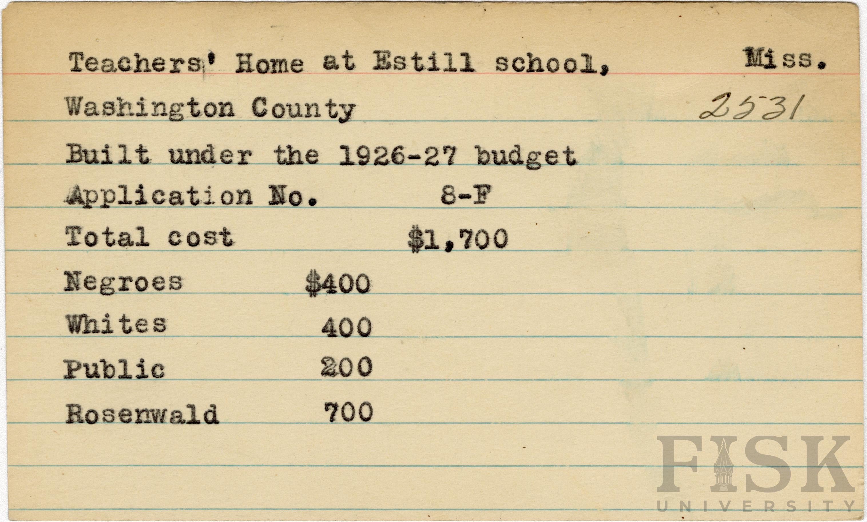 - School card from Rosenwald Fund for the teacher's home at Estill School No. 2 in Washington County, Mississippi