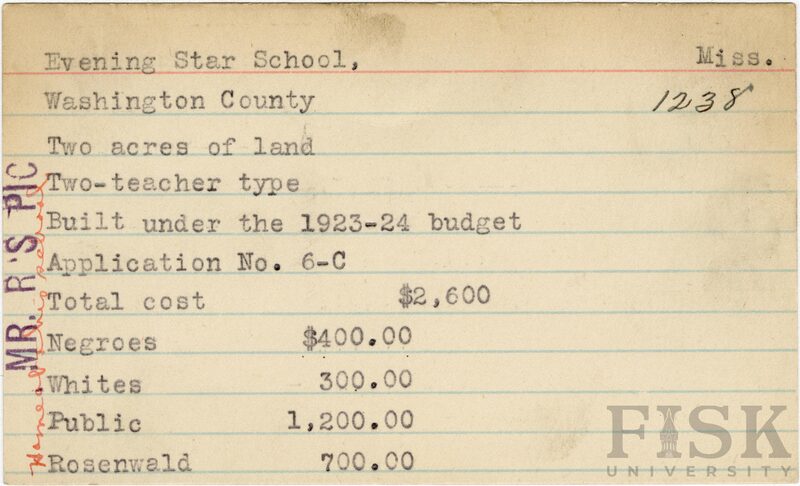 - School card from Rosenwald Fund for Evening Star School in Washington County, Mississippi with notes on the far left of the card that say, "Mr. R's Pic" and "home at this school"