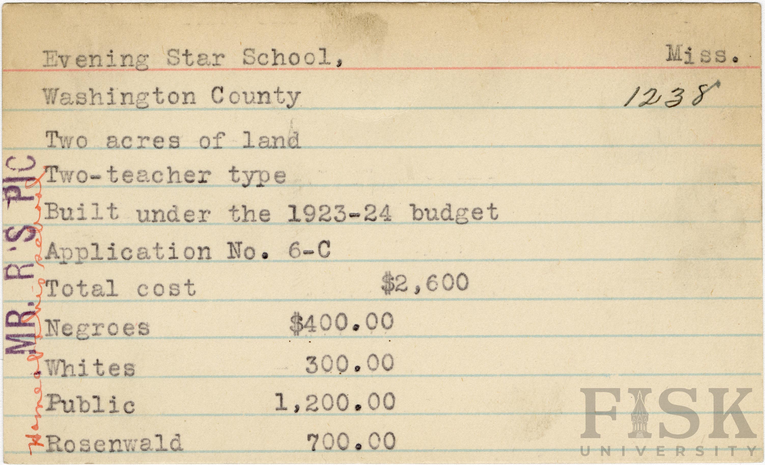 School card from Rosenwald Fund for Evening Star School in Washington County, Mississippi with notes on the far left of the card that say, "Mr. R's Pic" and "home at this school"