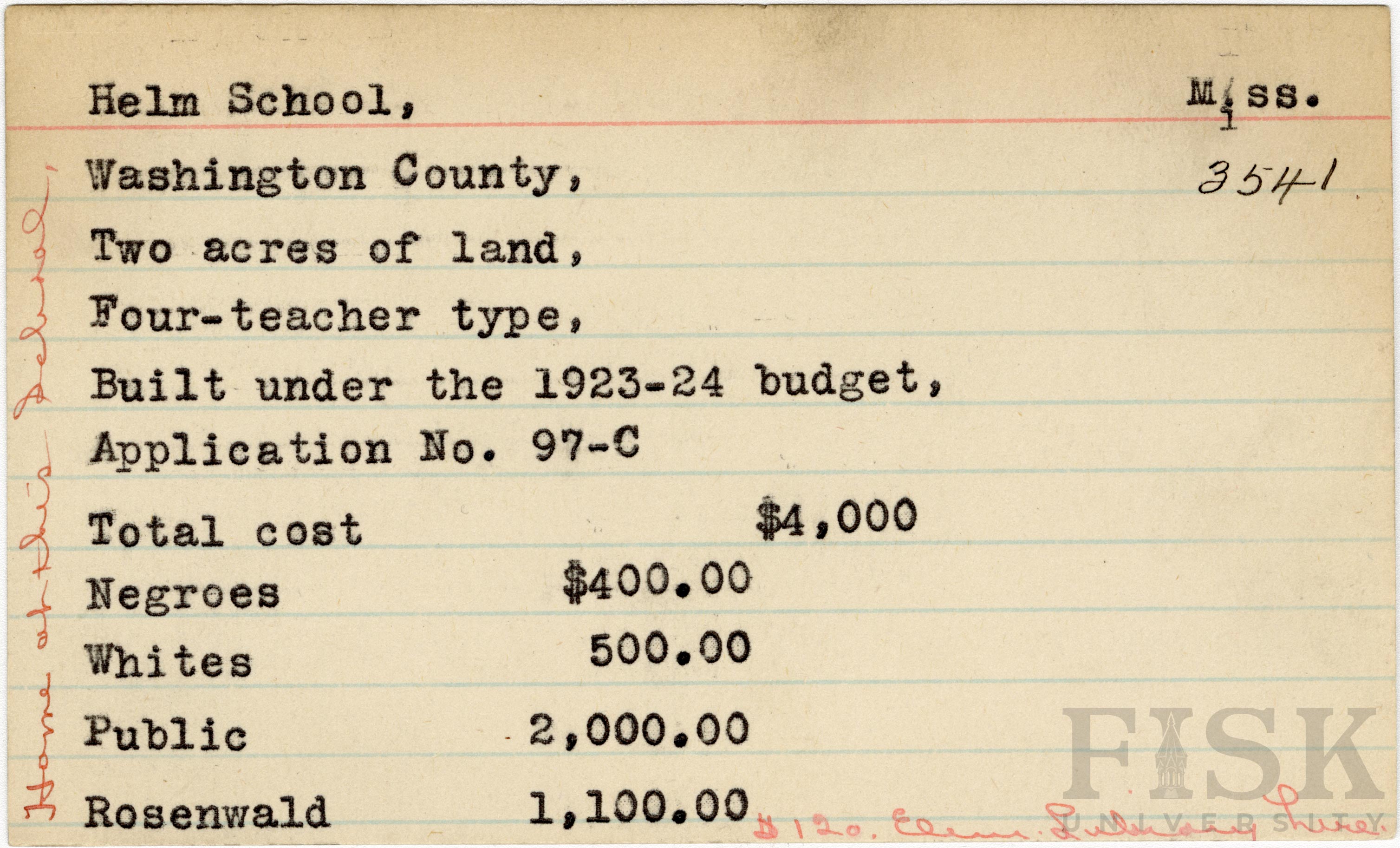 School card from Rosenwald Fund for Helm School in Washington County, Mississippi with handwritten notes on the card that say, "home at this school" and "$120 elem library here"