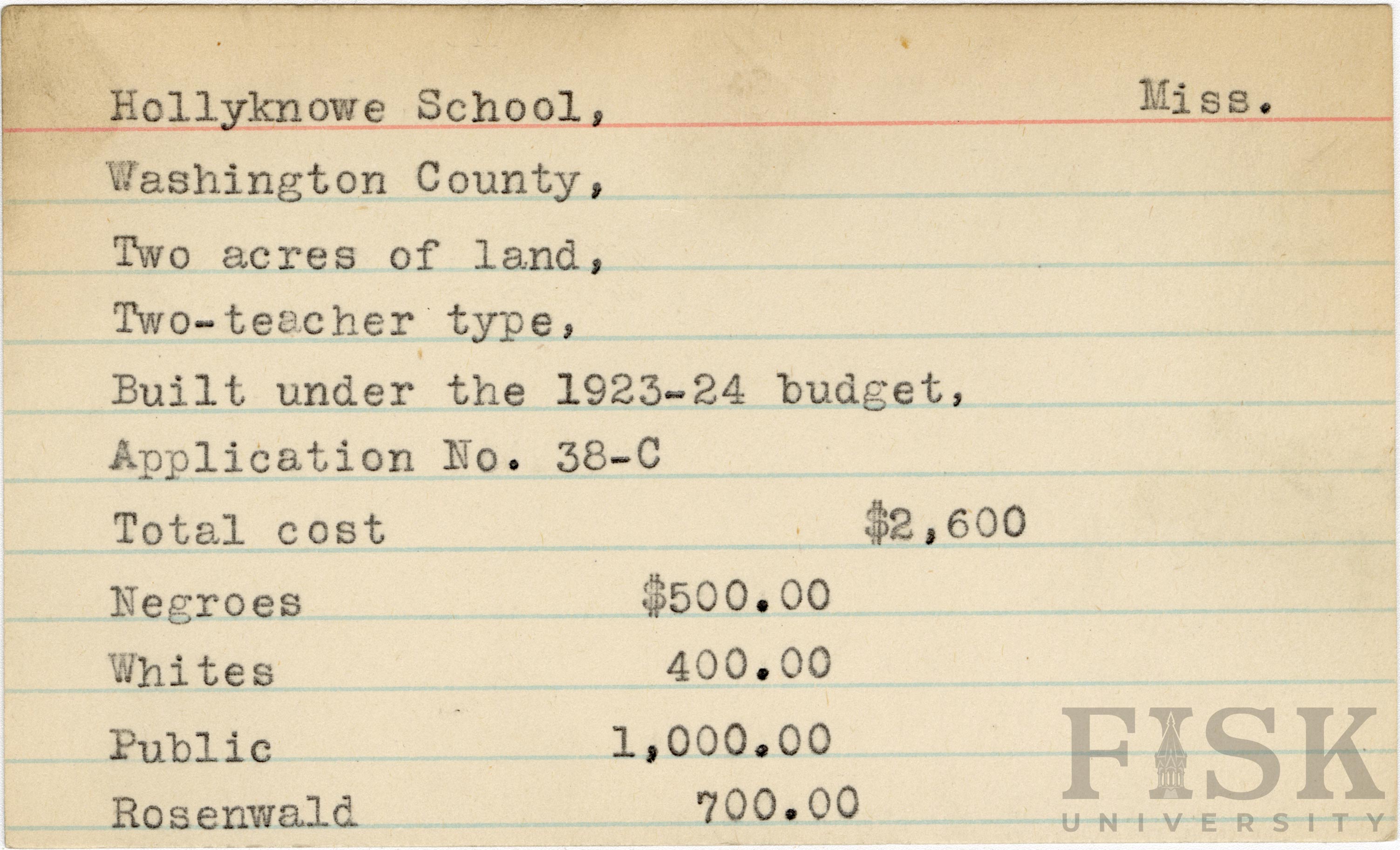 - School card from Rosenwald Fund for Hollyknowe School in Washington County, Mississippi