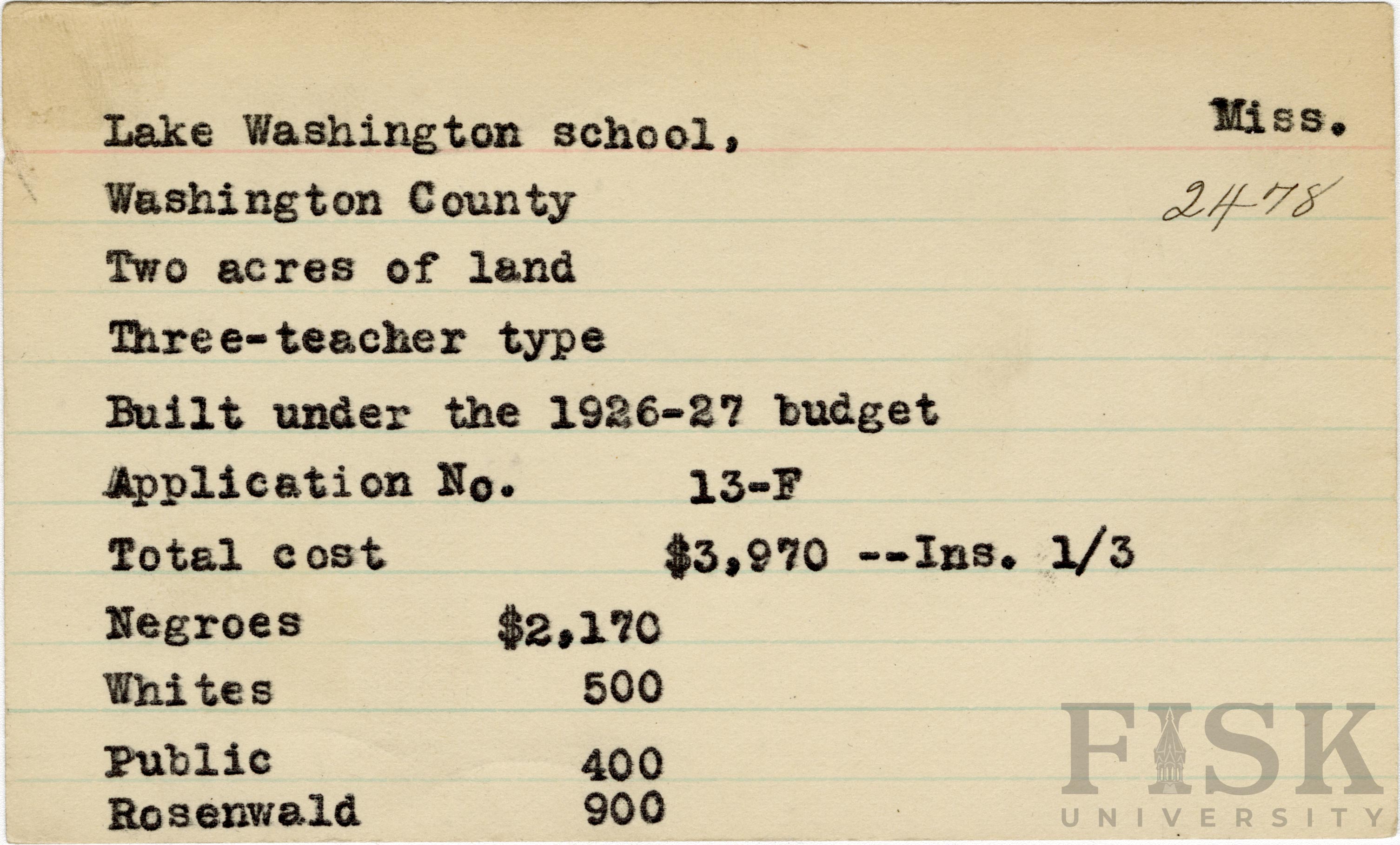 School card from Rosenwald Fund for Lake Washington School in Washington County, Mississippi with a section added to the budget contributions that says, "Ins. 1/3"