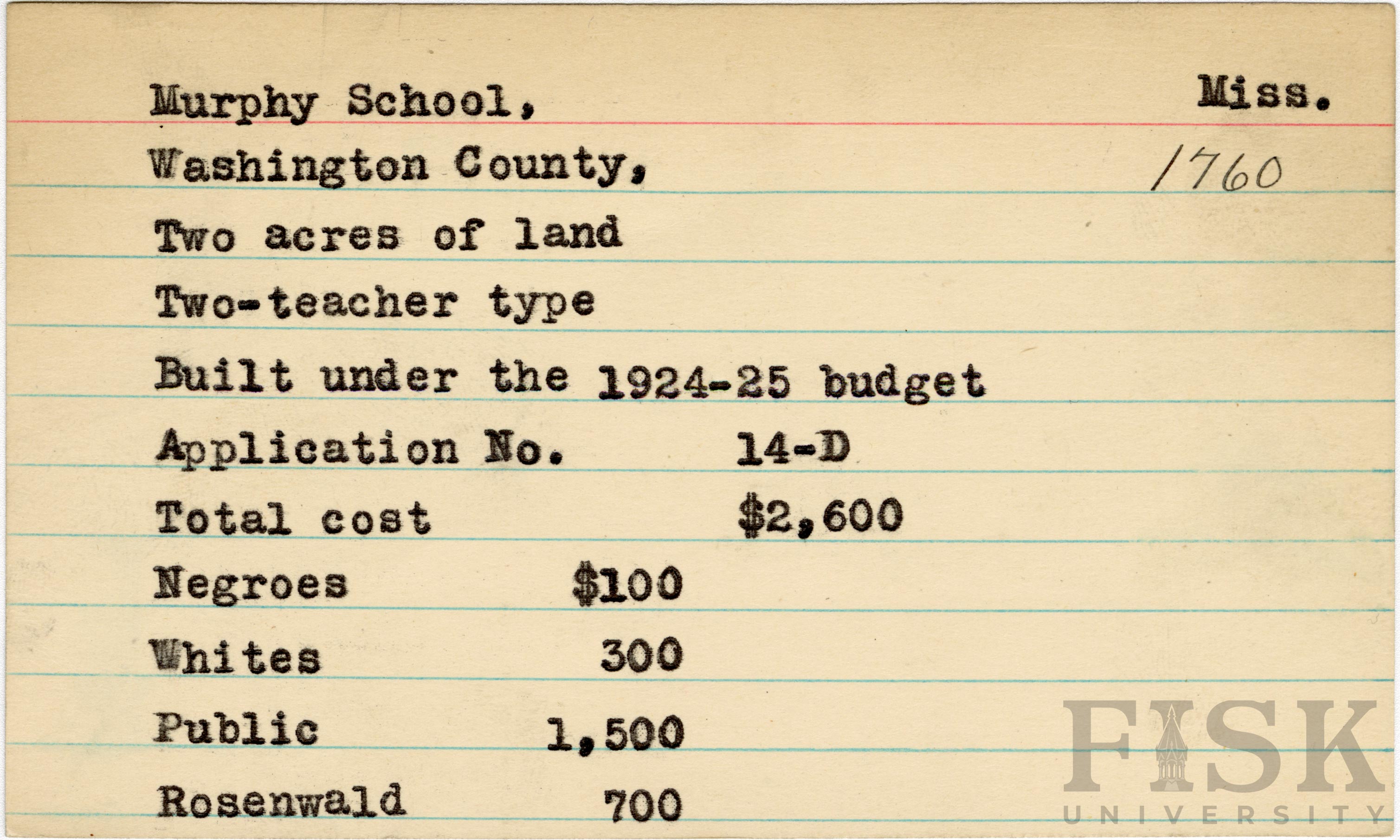 - School card from Rosenwald Fund for Murphy School in Washington County, Mississippi