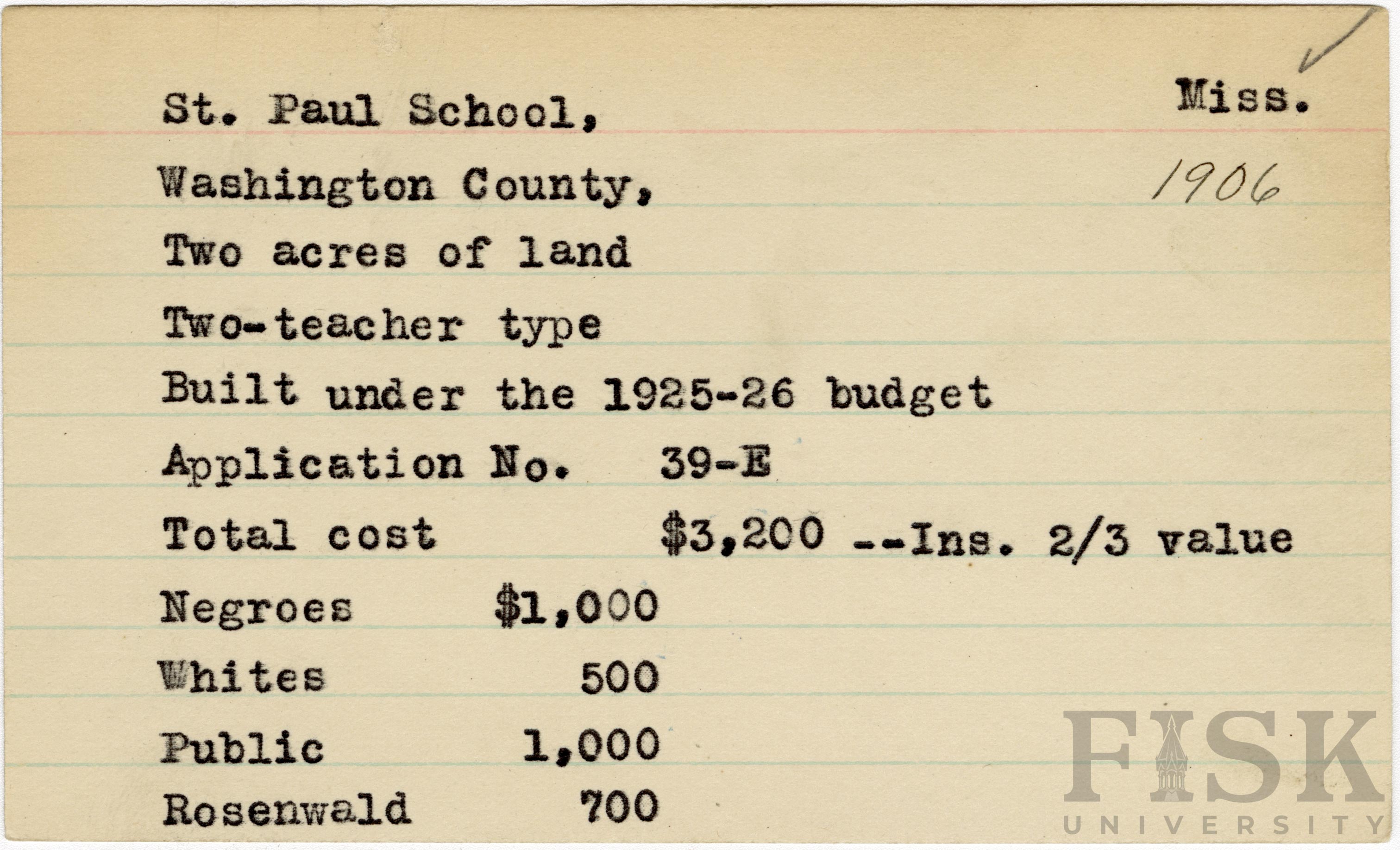 - School card from Rosenwald Fund for St. Paul School in Washington County, Mississippi with a section added to the budget contributions that says, "Ins. 2/3 value"