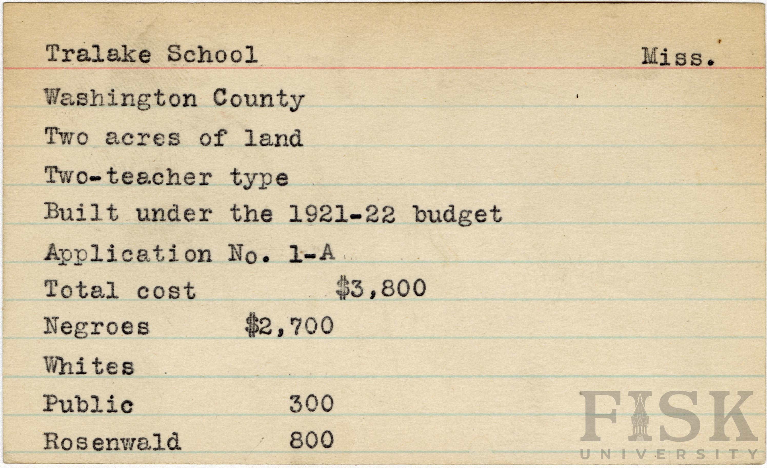 - School card from Rosenwald Fund for Tralake School in Washington County, Mississippi