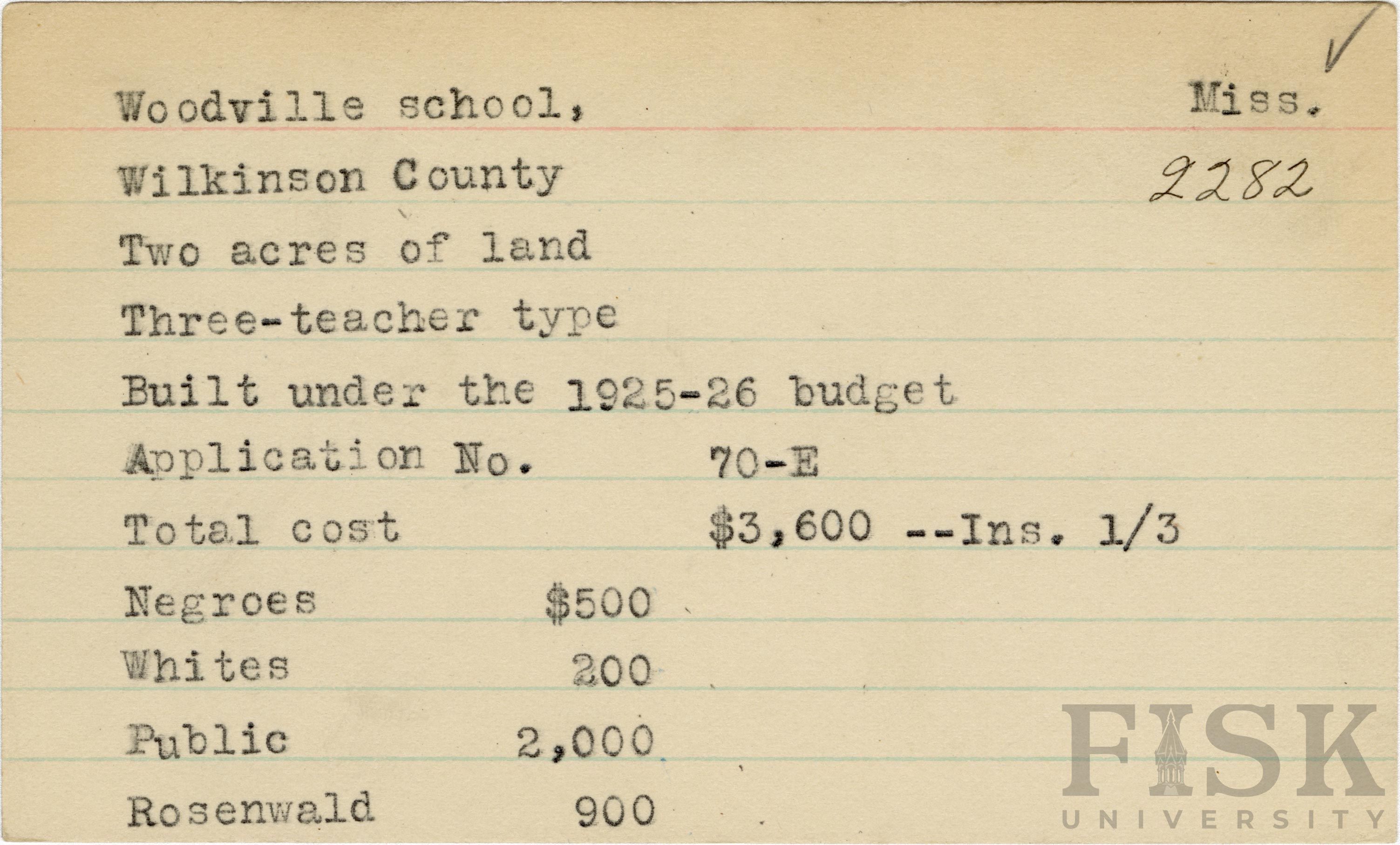 - School card from Rosenwald Fund for Woodville School in Wilkinson County, Mississippi with a section added to the budget contributions that says, "Ins. 1/3"
