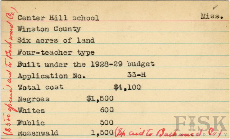 School card from Rosenwald Fund for Center Hill School in Winston County, Mississippi with handwritten notes on the card that say, "($500 special aid to Backward Co.)" and "(Sp. aid to Backward Co)"