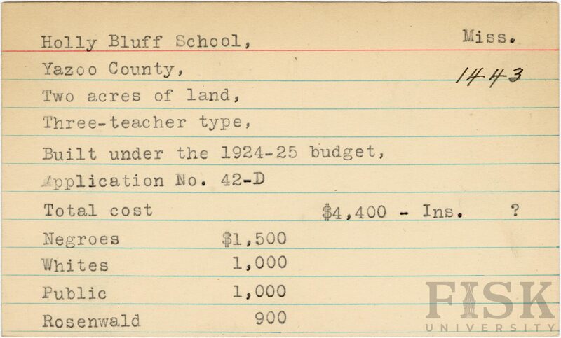 - School card from Rosenwald Fund for Holly Bluff School in Yazoo County, Mississippi with a section added to the budget contributions that says, "Ins. ?"