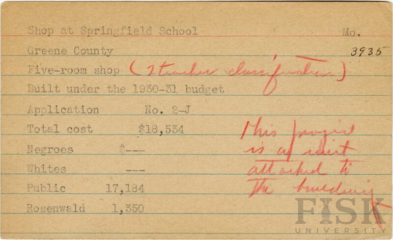 - School card from Rosenwald Fund for the five room shop at Springfield School in Greene County, Missouri with a handwritten note on the card that says, "this project is a unit attached to the building"