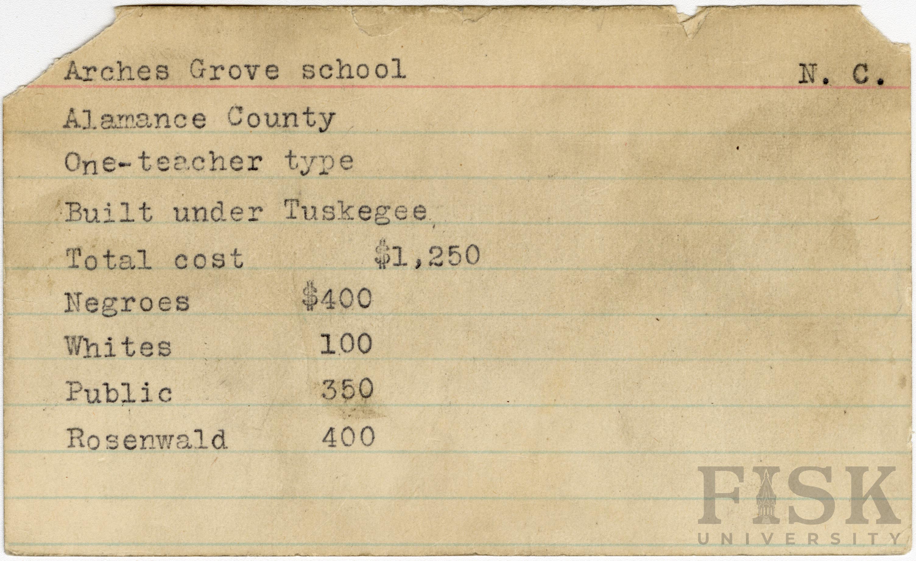School card for Arches Grove School in Alamance County, North Carolina