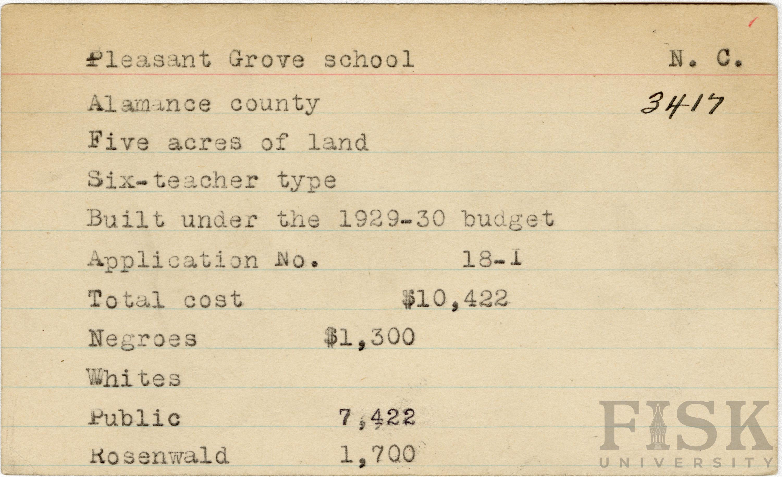 School card for Pleasant Grove School in Alamance County, North Carolina