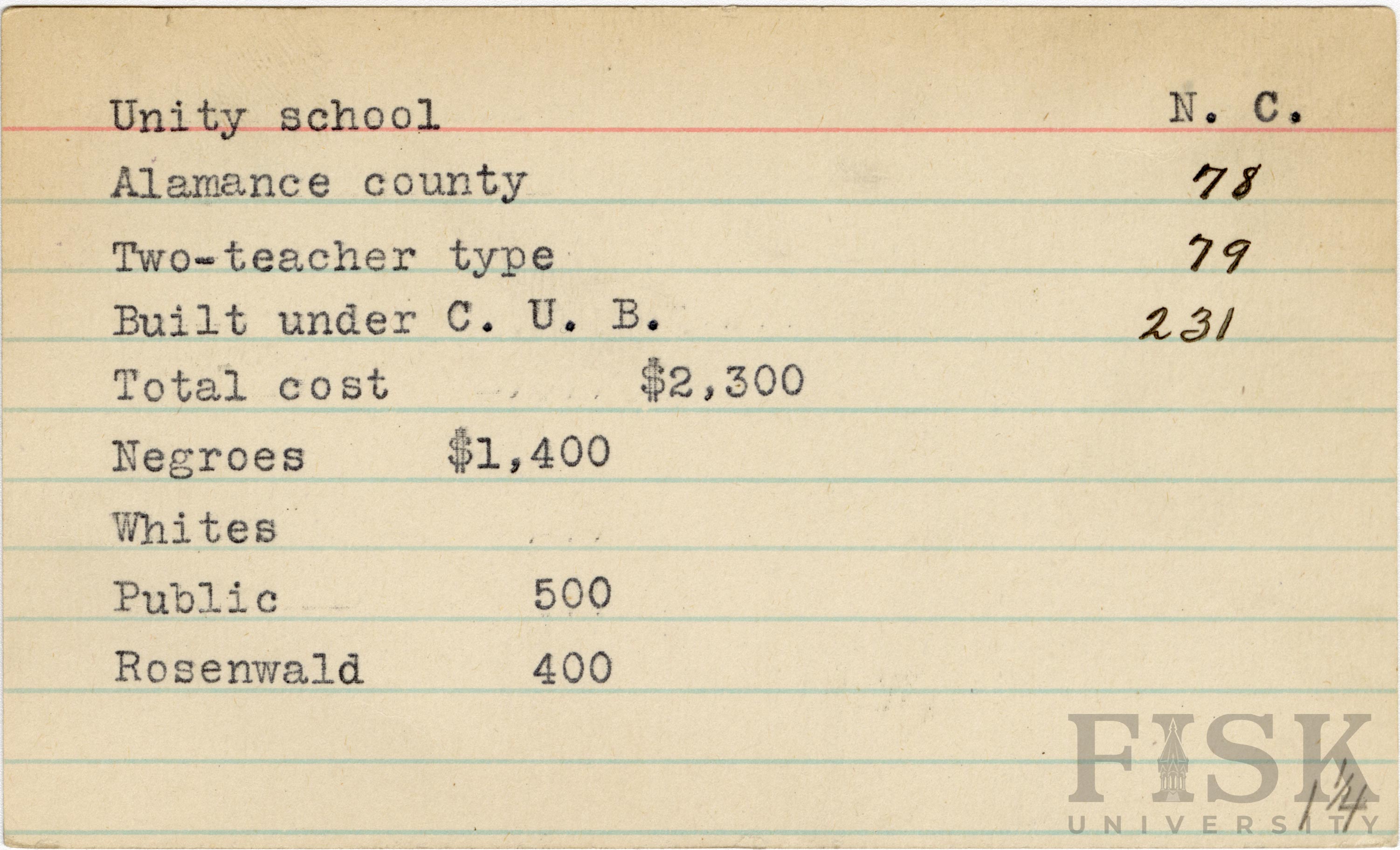 School card for Unity School in Alamance County, North Carolina