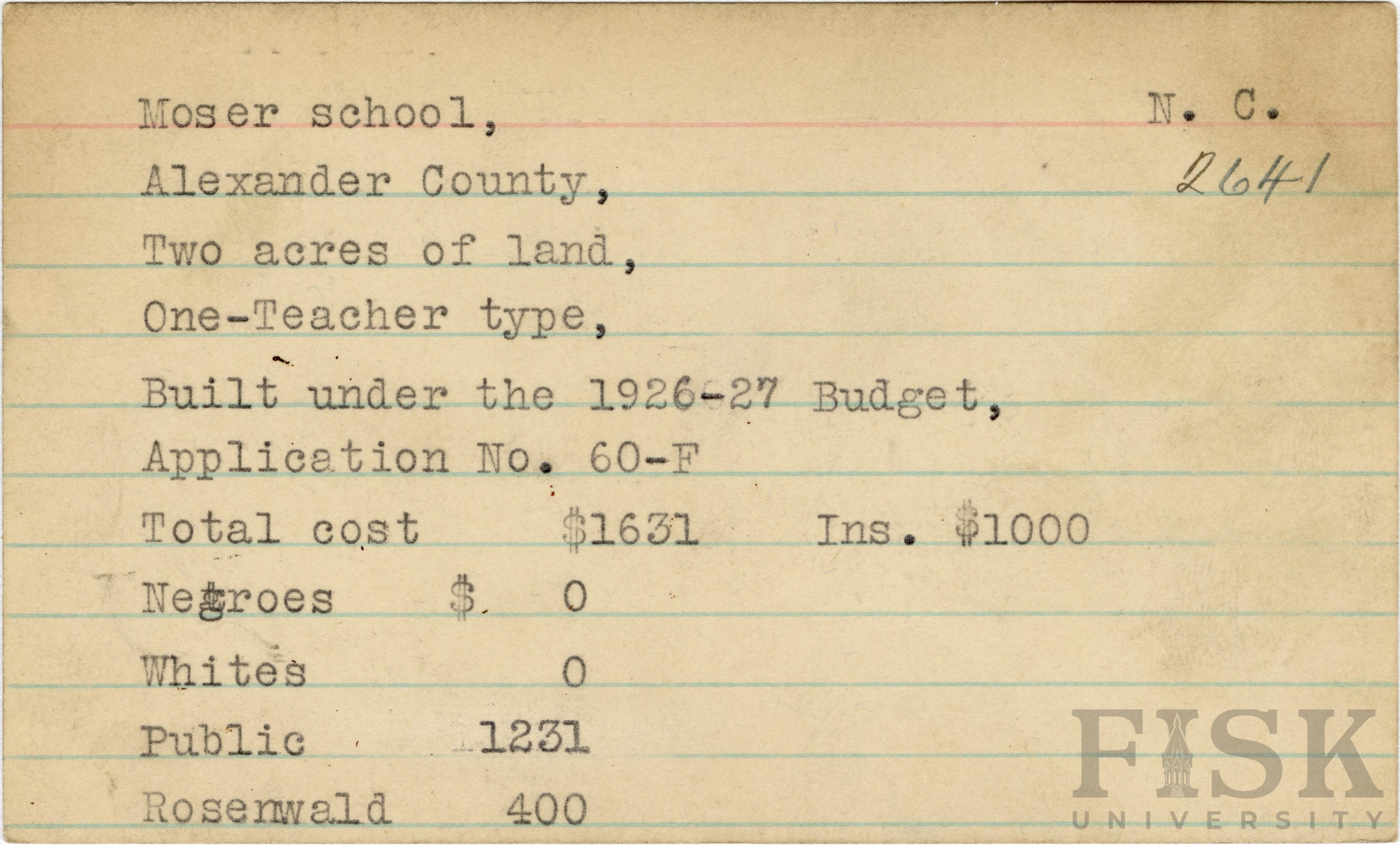 - Julius Rosenwald Fund--Buildings, African American schools--History--20th century, African American schools--Moser School