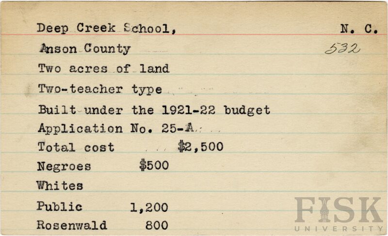- Julius Rosenwald Fund--Buildings, African American schools--History--20th century, African American schools--Deep Creek School