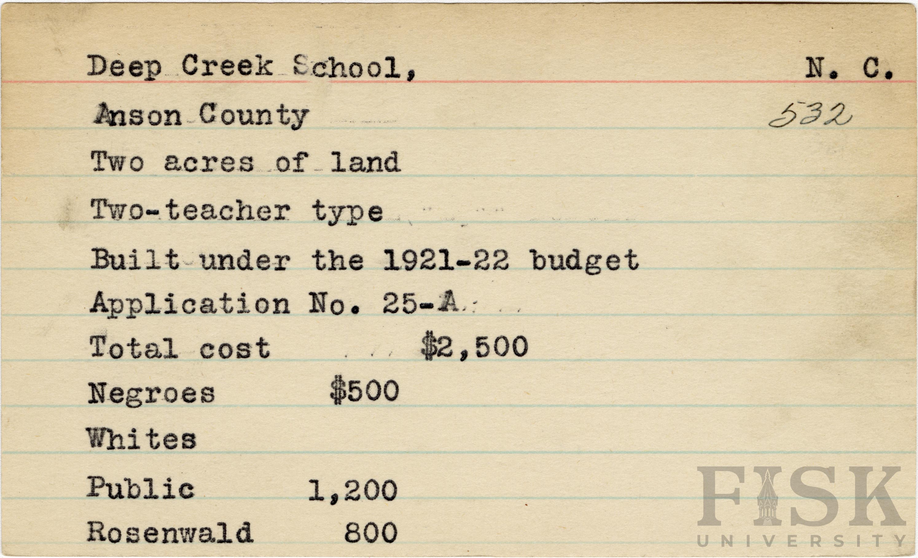 School card for Deep Creek School in Anson County, North Carolina