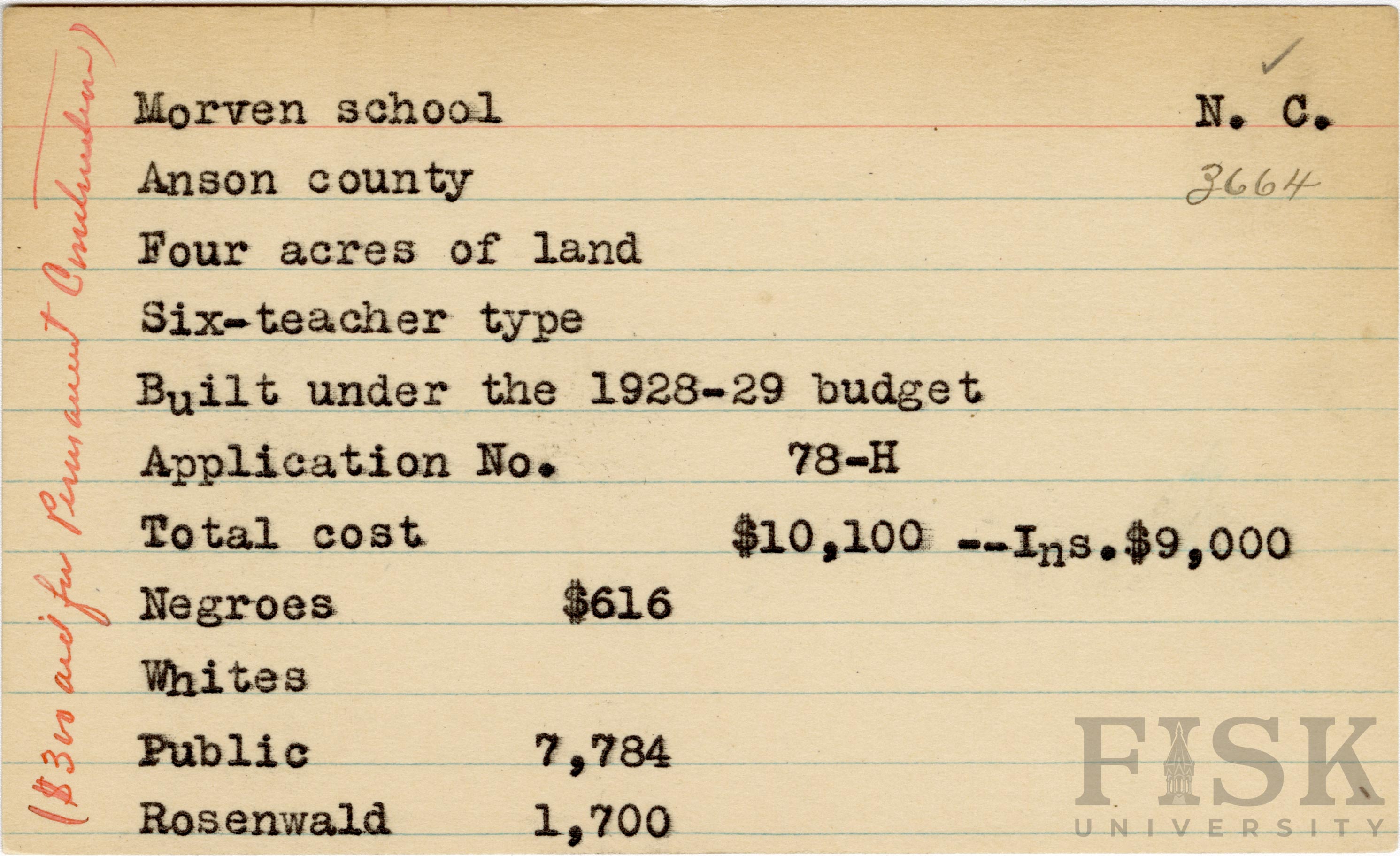 School card for Morven School in Anson County, North Carolina with a section added to the budget contributions that says, "Ins. $9,000" and a handwritten note on the far left of the card that says, "($300 aid for permanent construction"