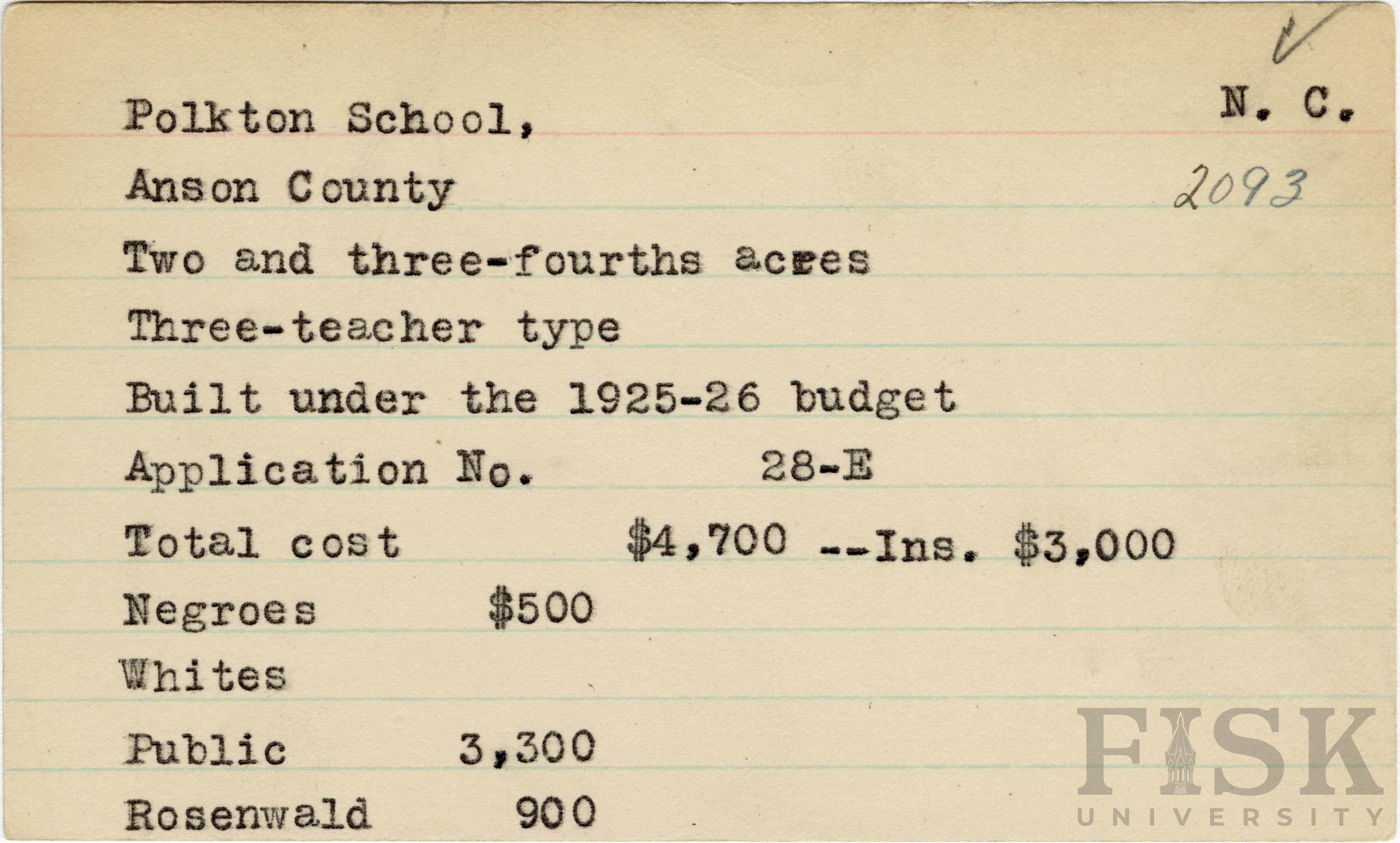 - Julius Rosenwald Fund--Buildings, African American schools--History--20th century, African American schools--Polkton School
