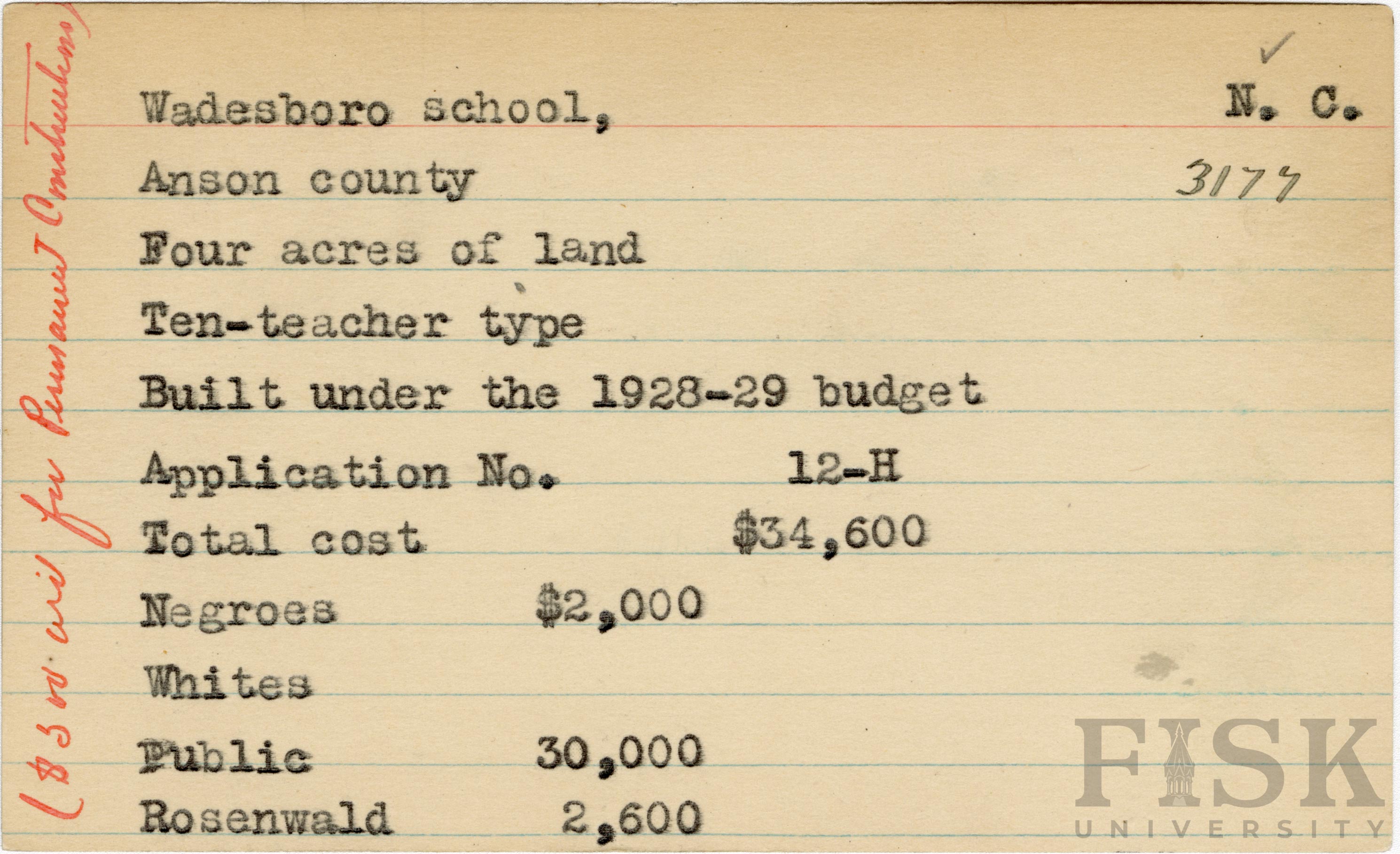 - School card for Wadesboro School in Anson County, North Carolina with a handwritten note on the far left of the card that says, "($500 aid for permanent construction)"
