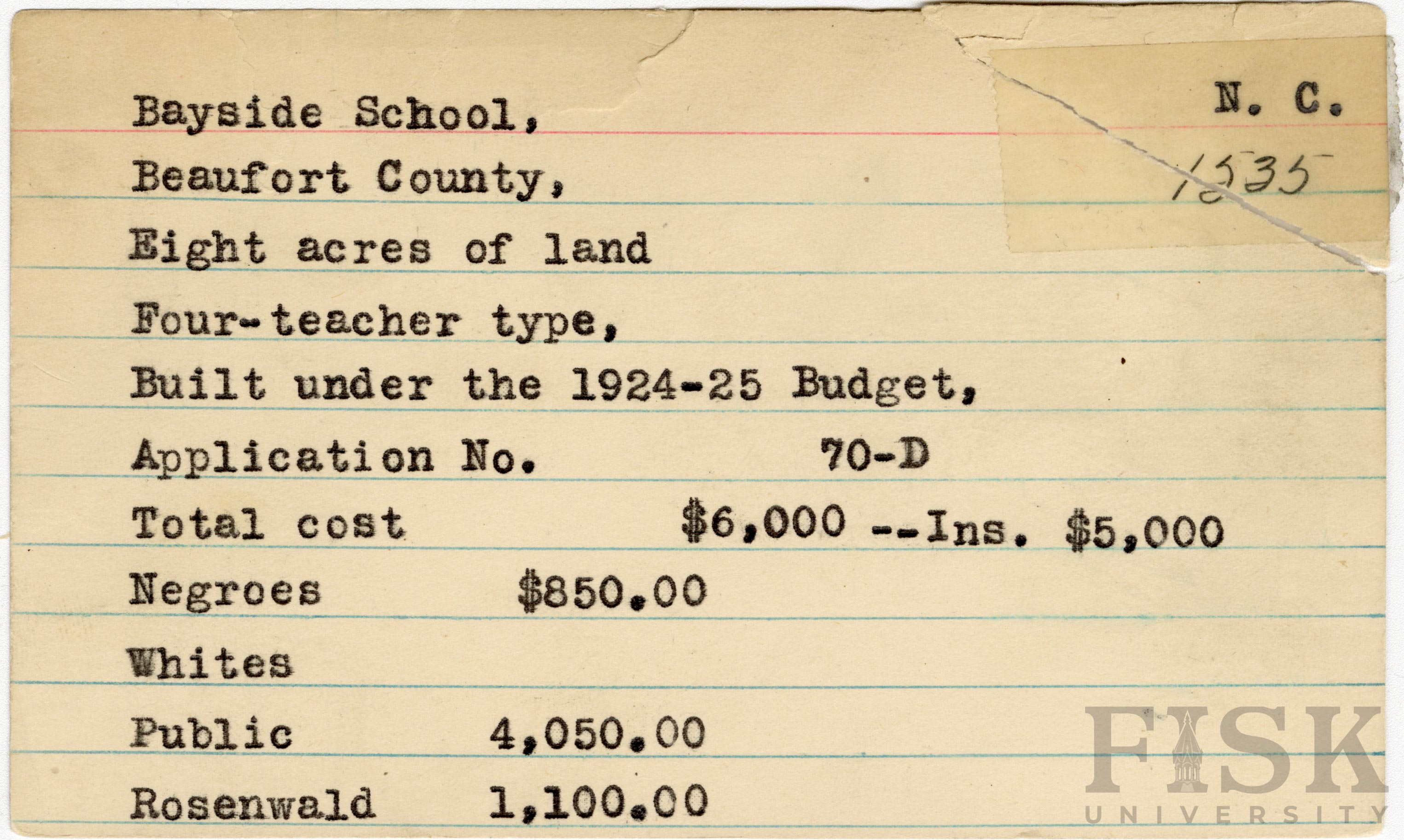 - Julius Rosenwald Fund--Buildings, African American schools--History--20th century, African American schools--Bayside School