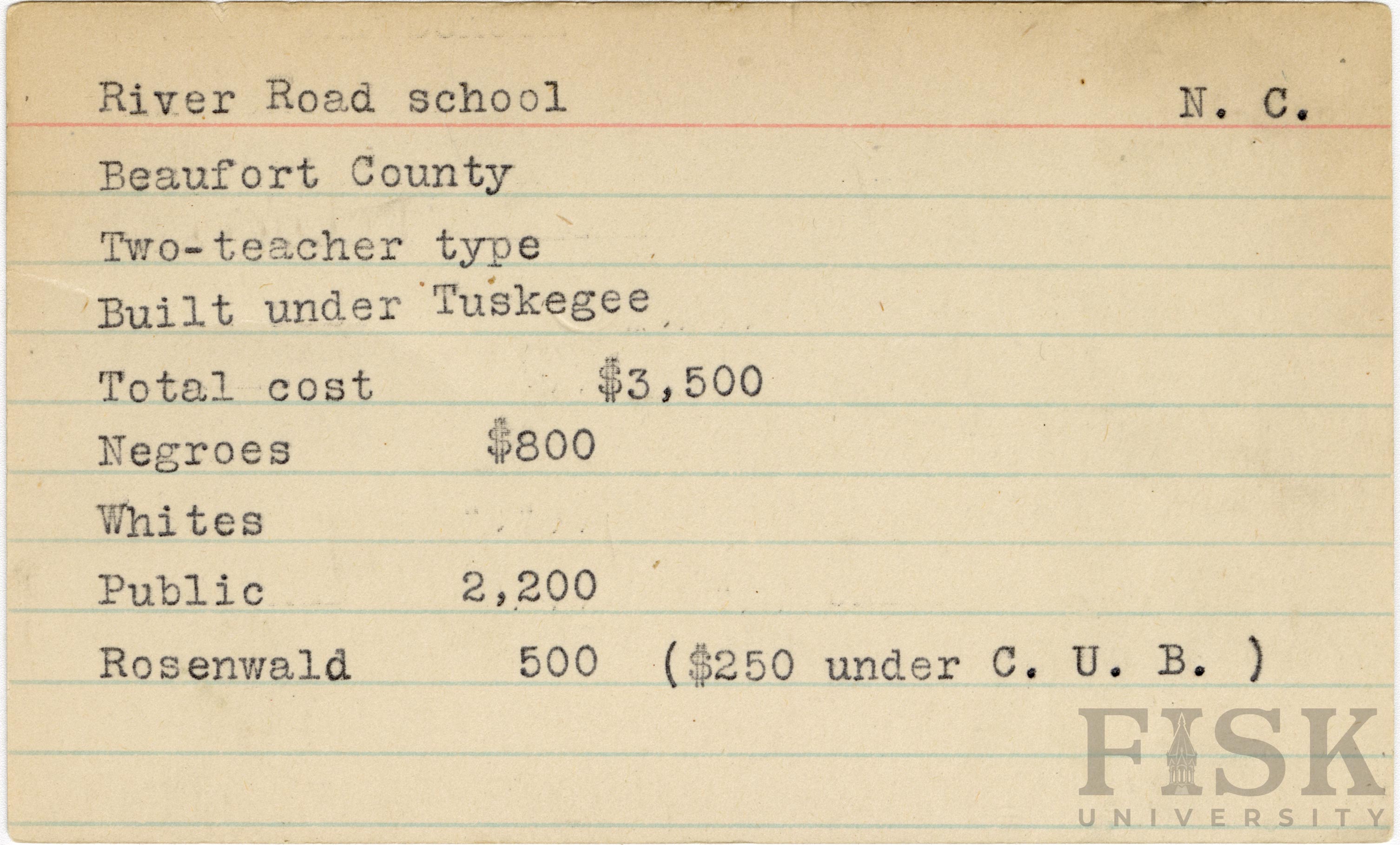 - School card for River Road School in Beaufort County, North Carolina with "($250 under C.U.B.)" added next to the Rosenwald budget contribution