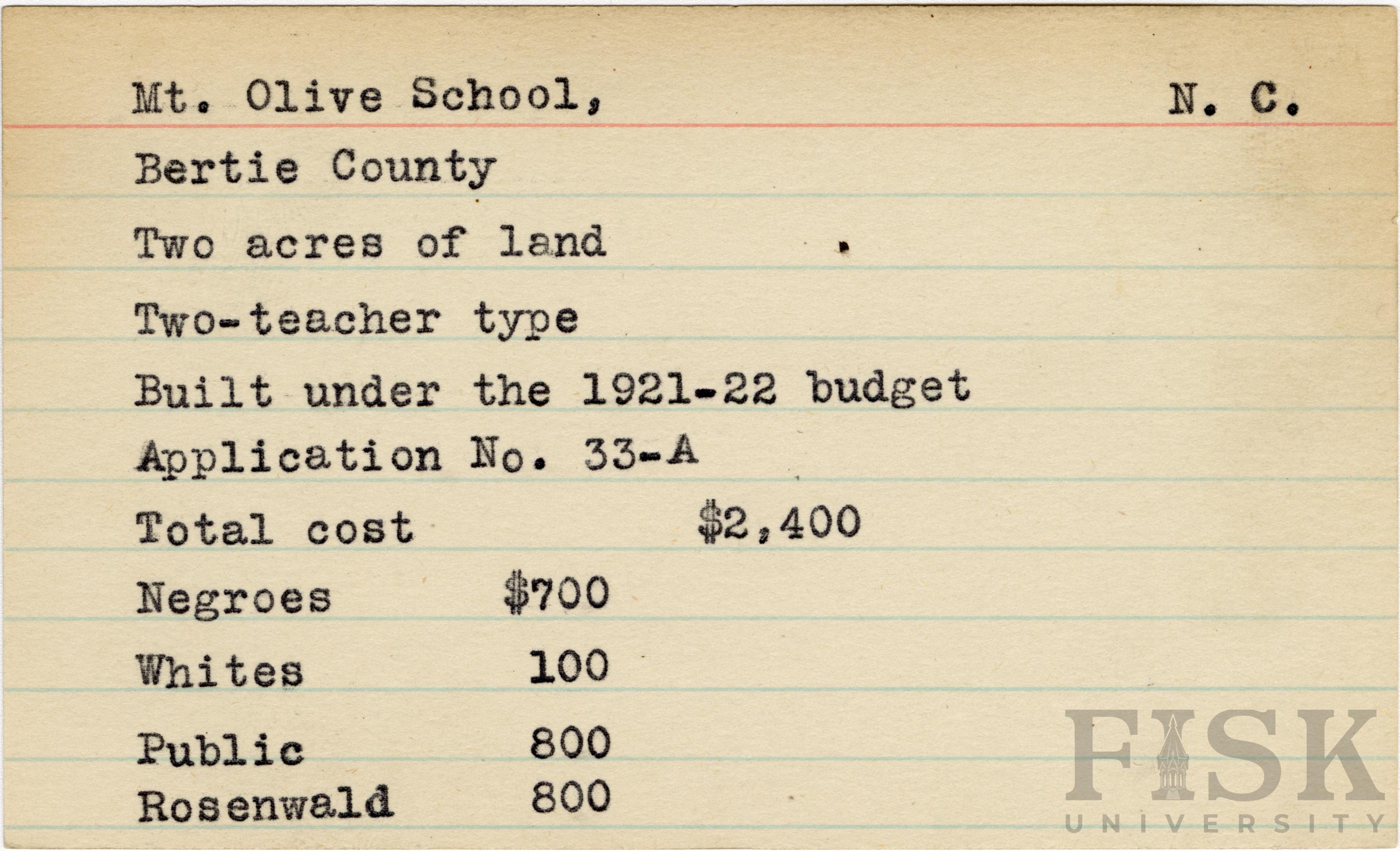 - School card for Mt. Olive School in Bertie County, North Carolina