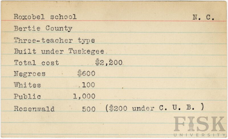 School card for Roxobel School in Bertie County, North Carolina with "($200 under C.U.B.)" added nexyt to the Rosenwald budget contributions