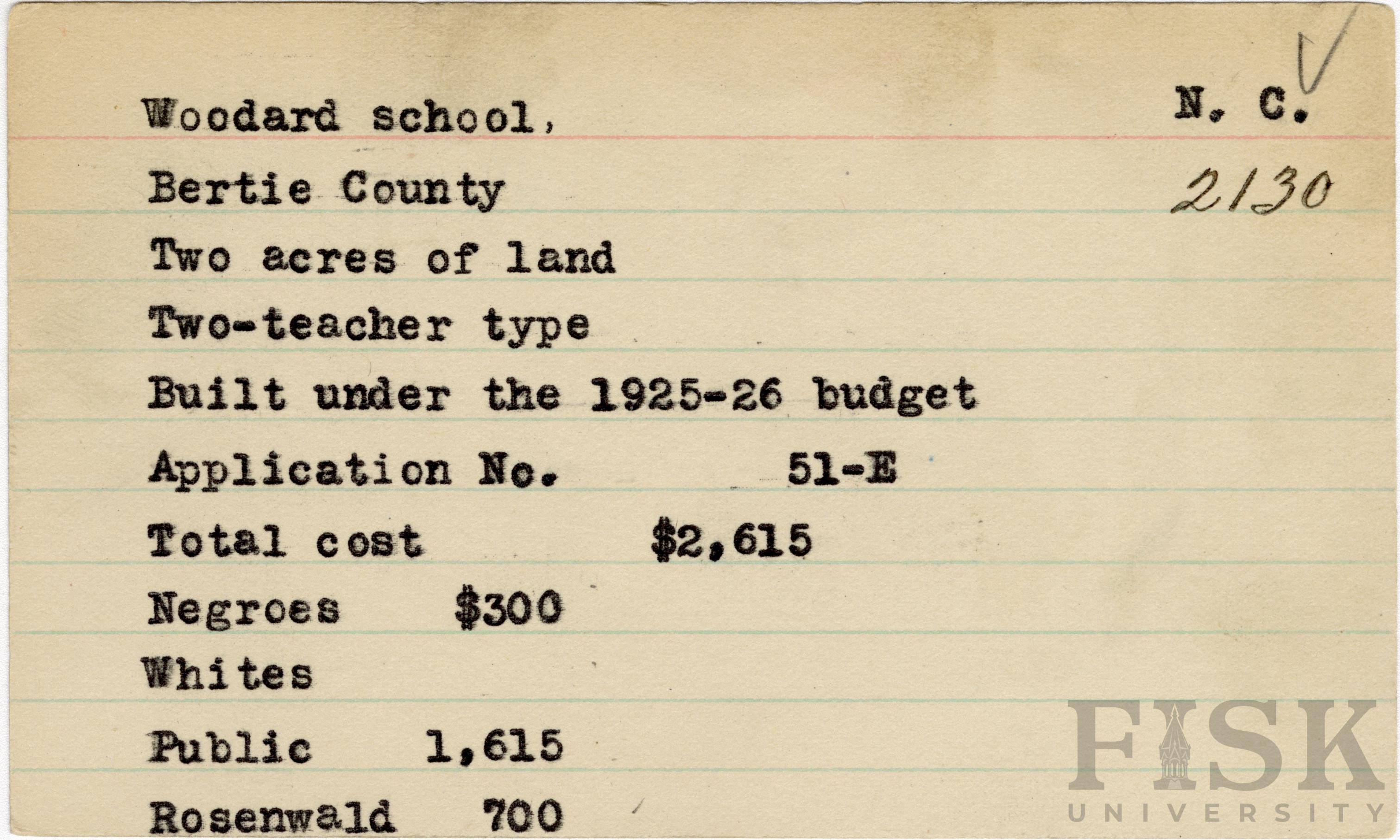 School card for Woodard School in Bertie County, North Carolina