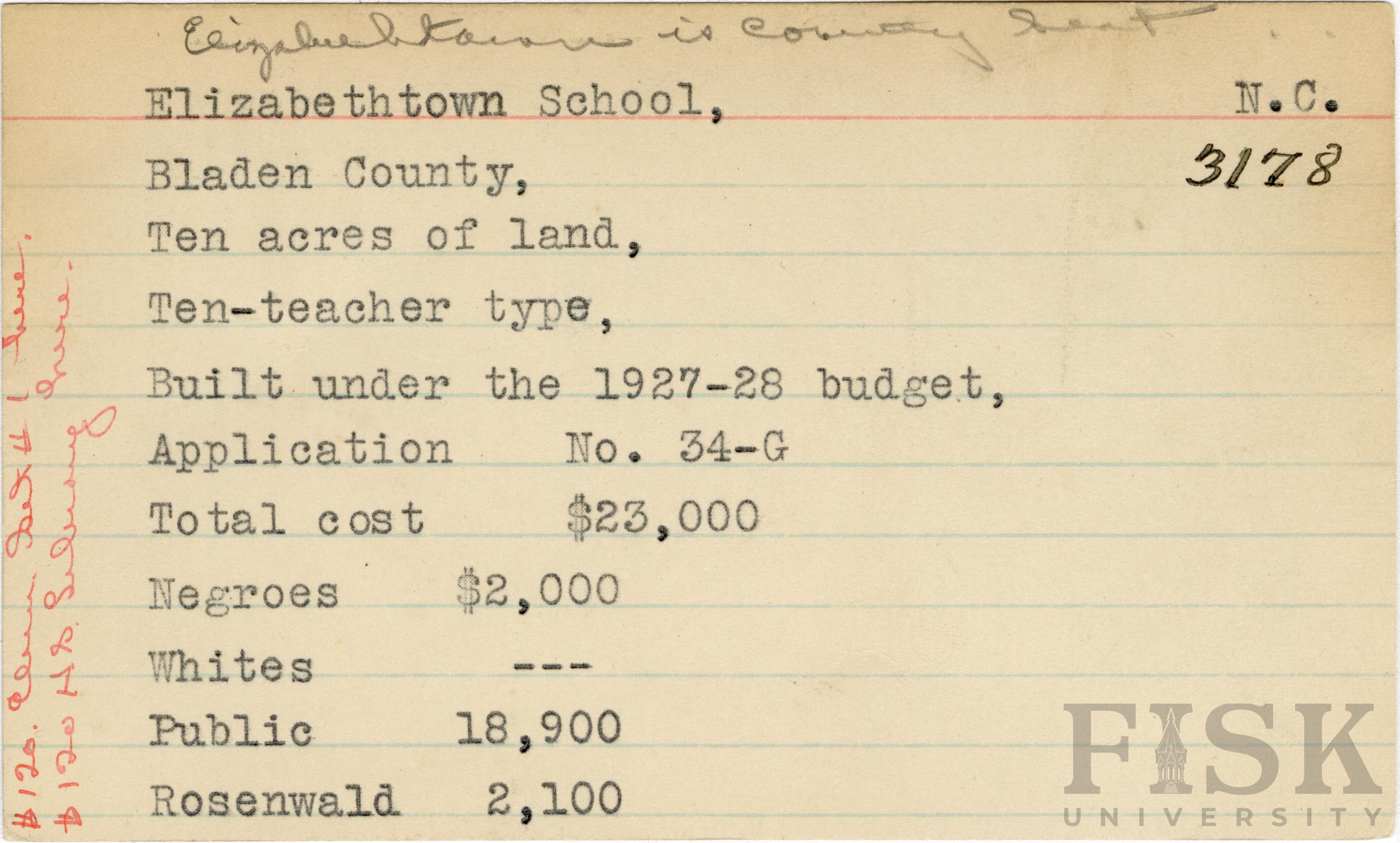 - School card for Elizabethtown School in Bladen County, North Carolina with handwritten notes that say, "$120 elem [unclear] here" and "$120 H.S. library here"