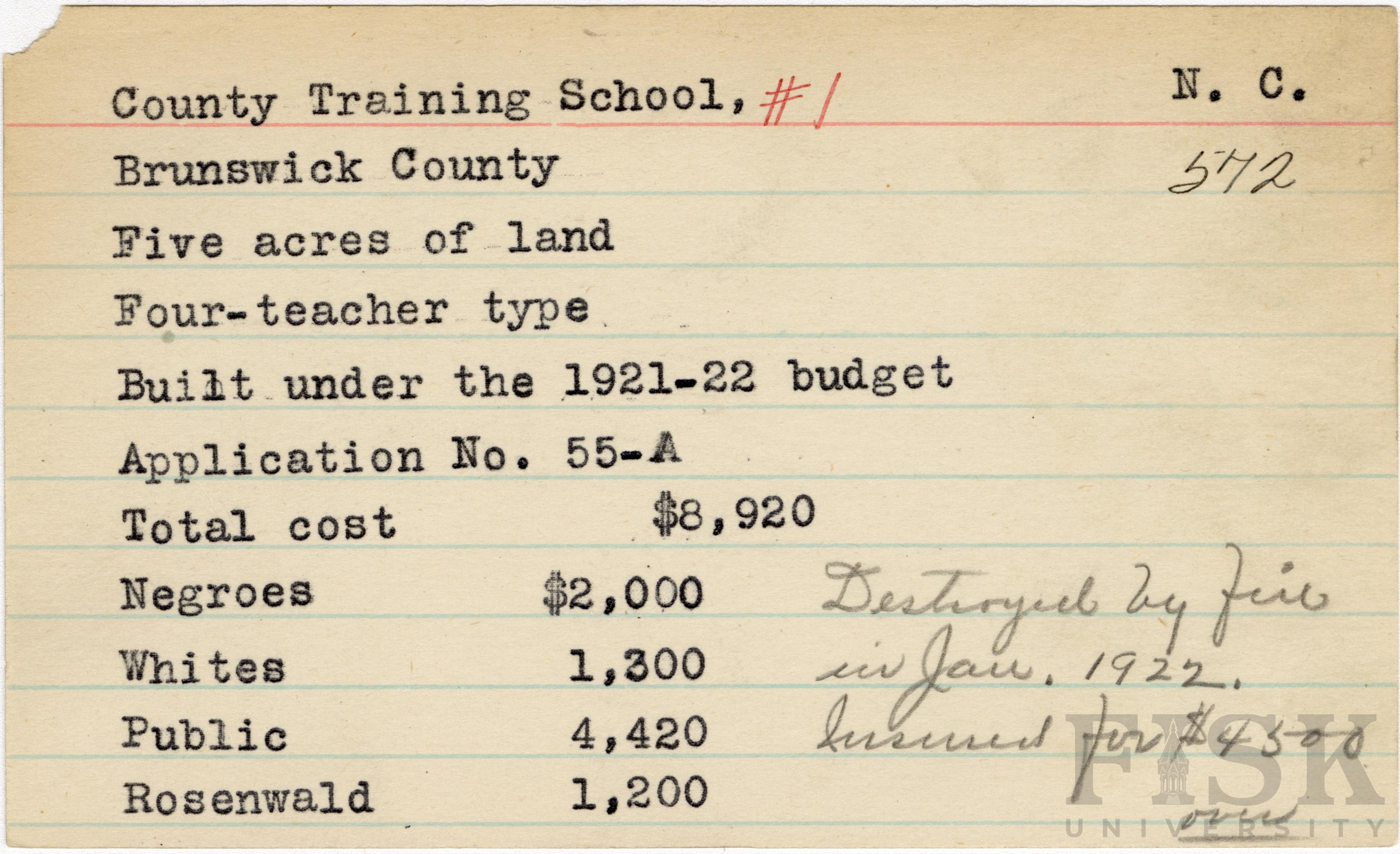 - School card for County Training School No. 1 in Brunswick County, North Carolina with a handwritten note on the card that says, "Destroyed by fire in Jan 1922. Insured for $4,500". The back of the card says, "$4500 was [unclear] where the [unclear] which was acting as county training closed its doors. See [unclear] letter of Dec 13, 1923"