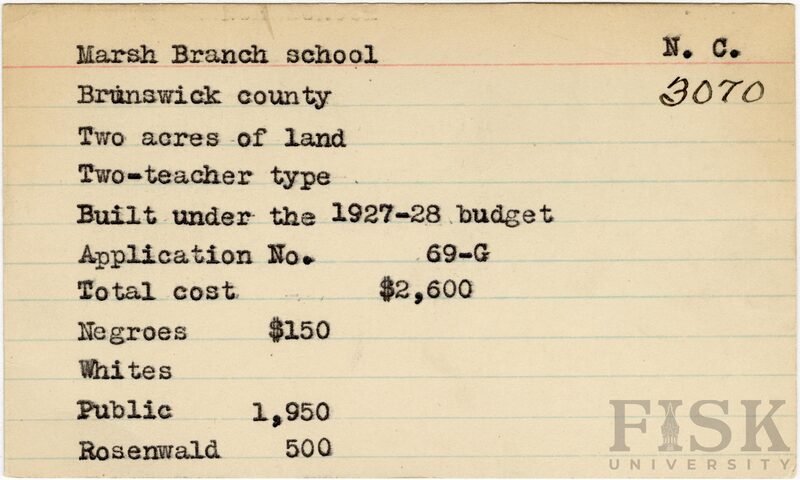 - School card for Marsh Branch School in Brunswick County, North Carolina