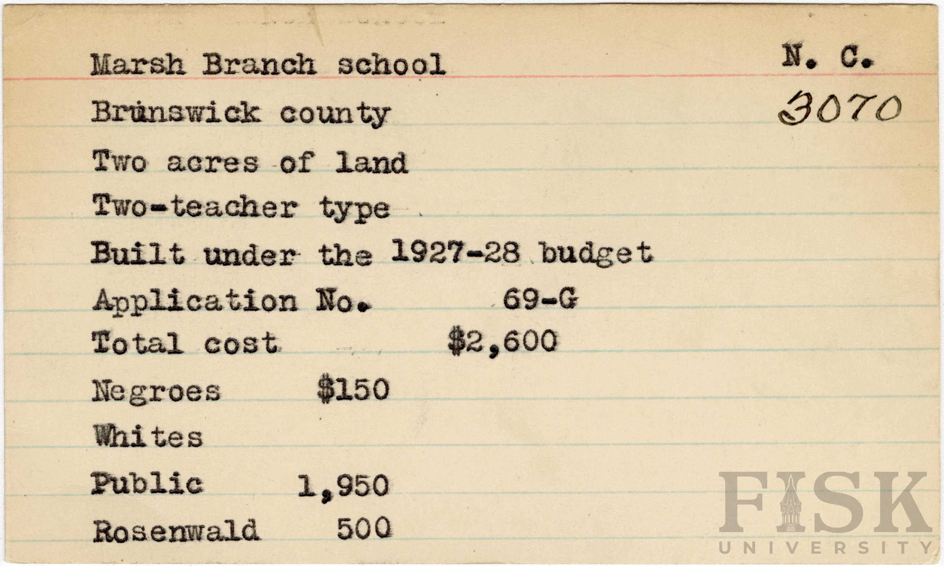 School card for Marsh Branch School in Brunswick County, North Carolina