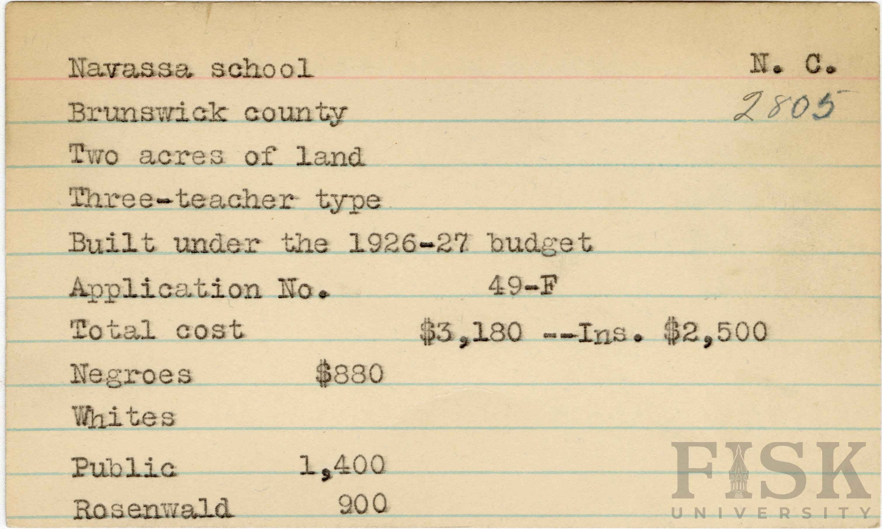 - Julius Rosenwald Fund--Buildings, African American schools--History--20th century, African American schools--Navassa School