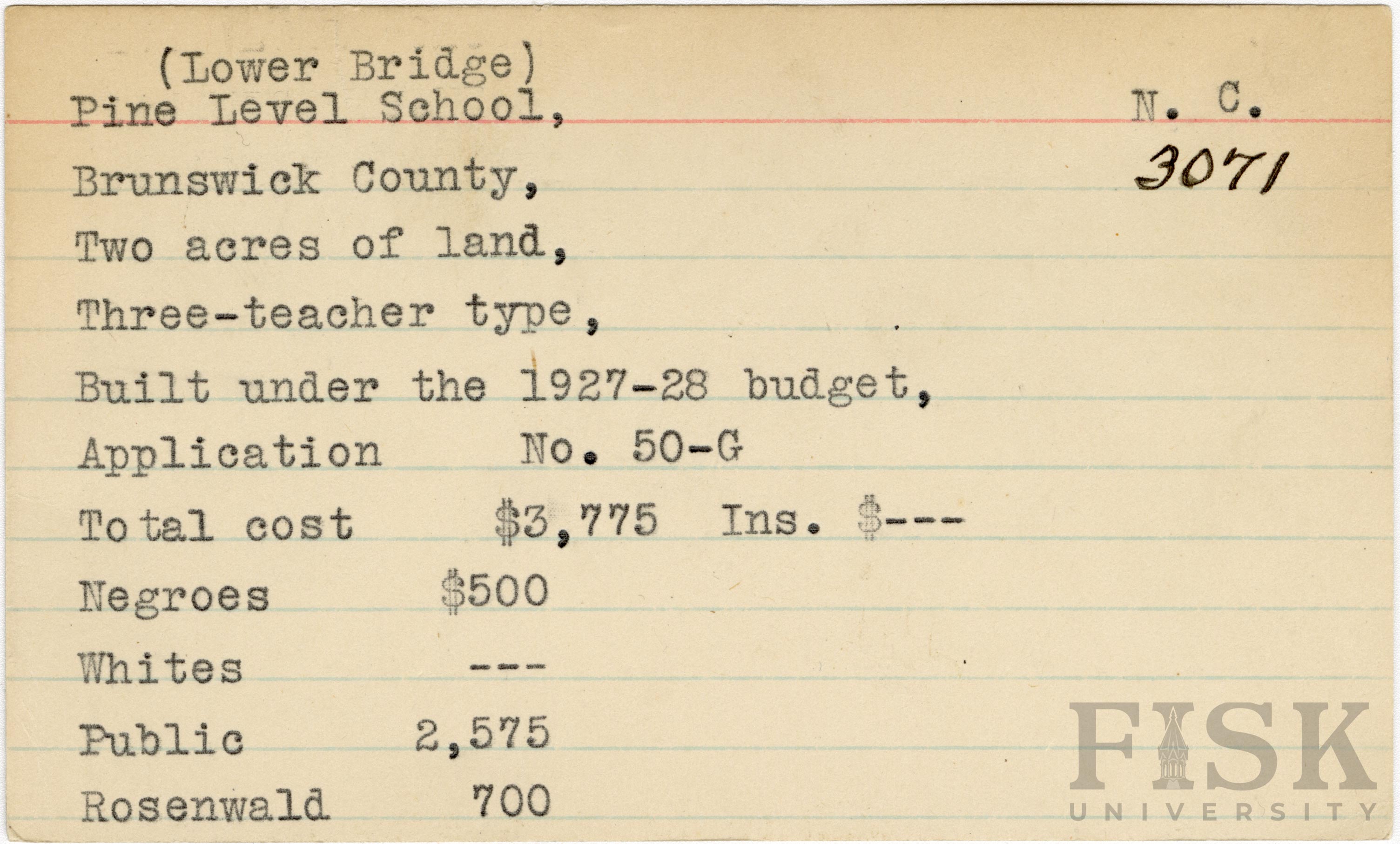 - Julius Rosenwald Fund--Buildings, African American schools--History--20th century, African American schools--Pine Level School