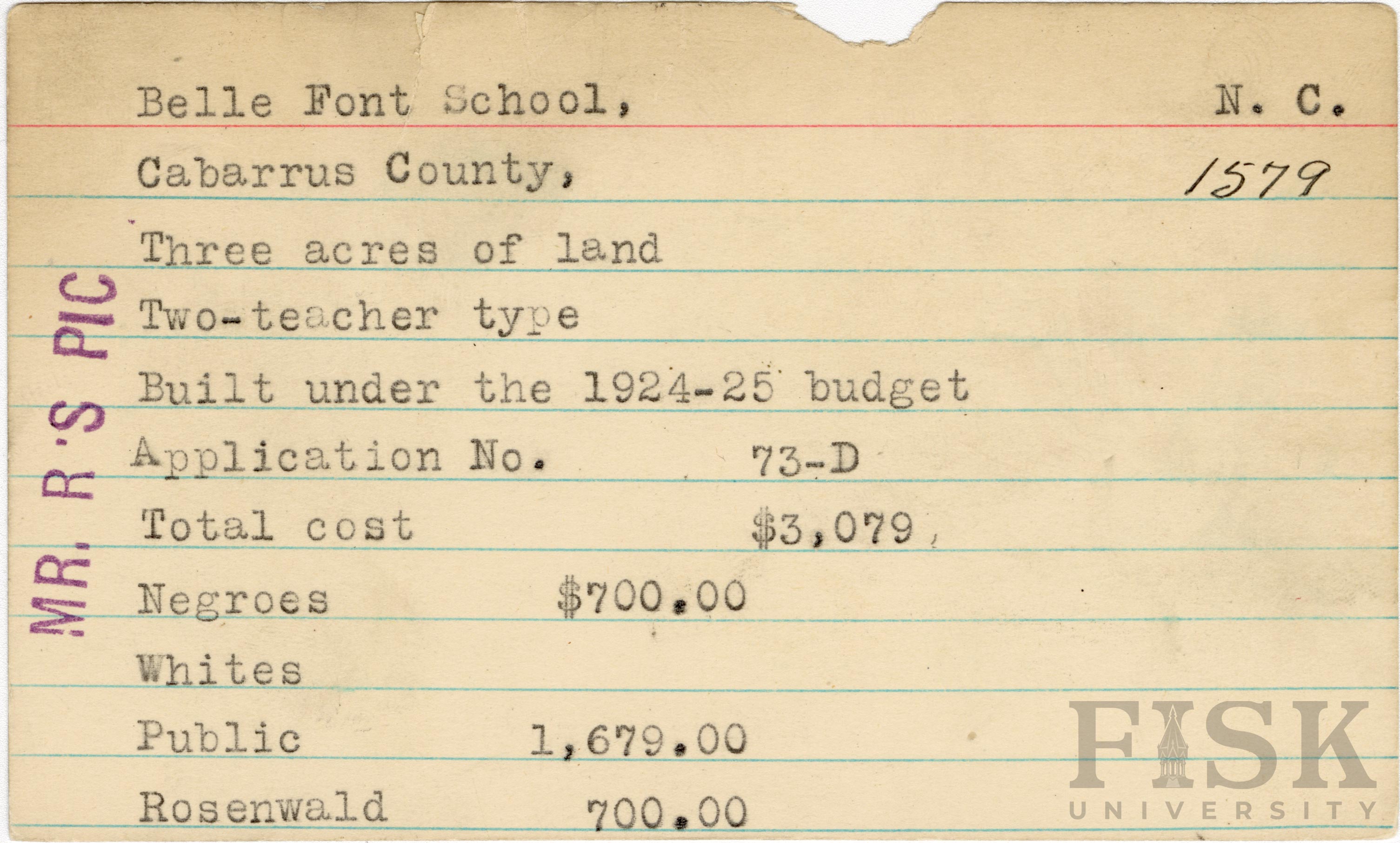 School card for Belle Font School in Cabarrus County, North Carolina with a note on the far left of the card that says, "Mr. R's Pic"