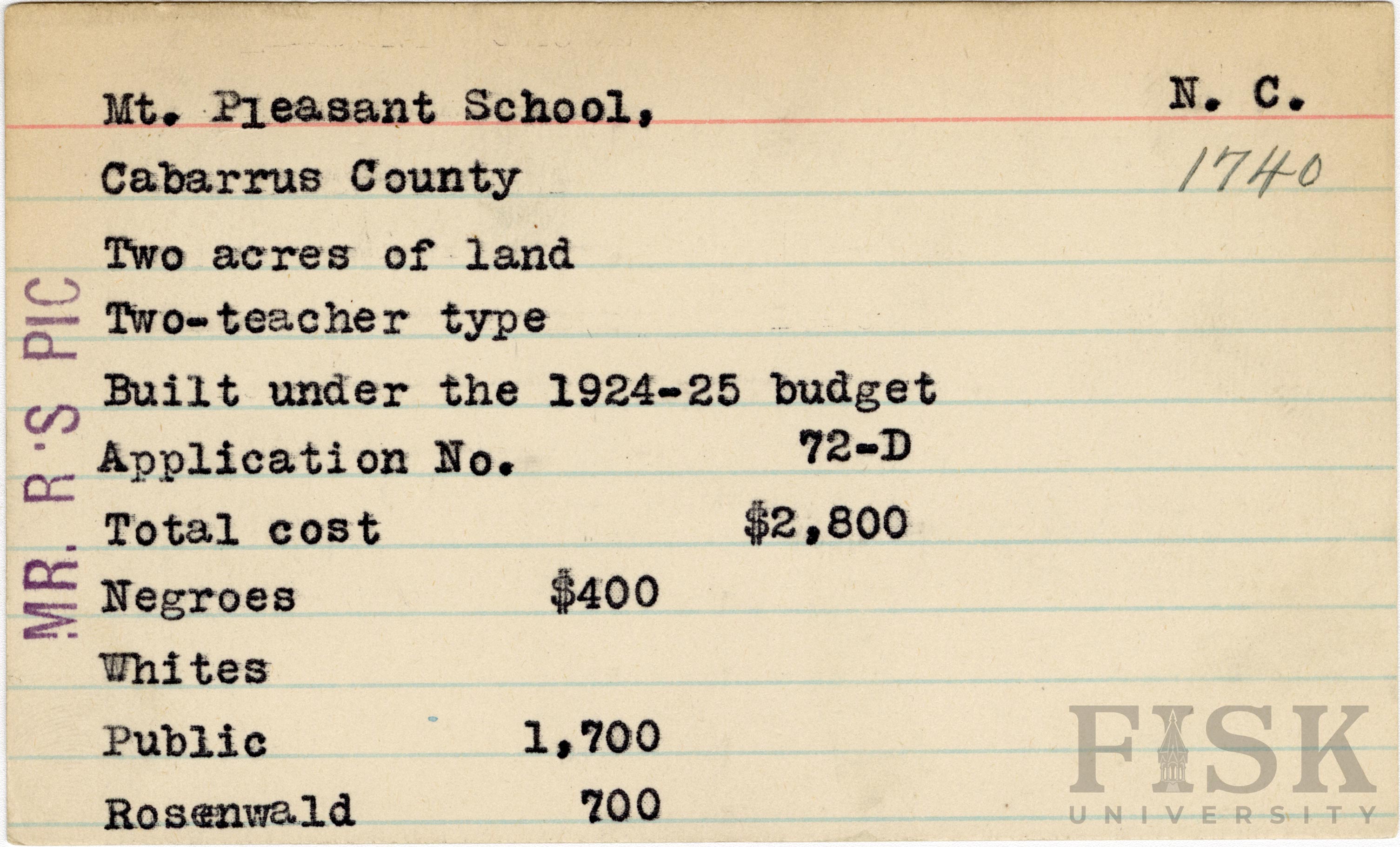School card for Mt. Pleasant School in Cabarrus County, North Carolina with a note on the far left of the card that says, "Mr. R's Pic"