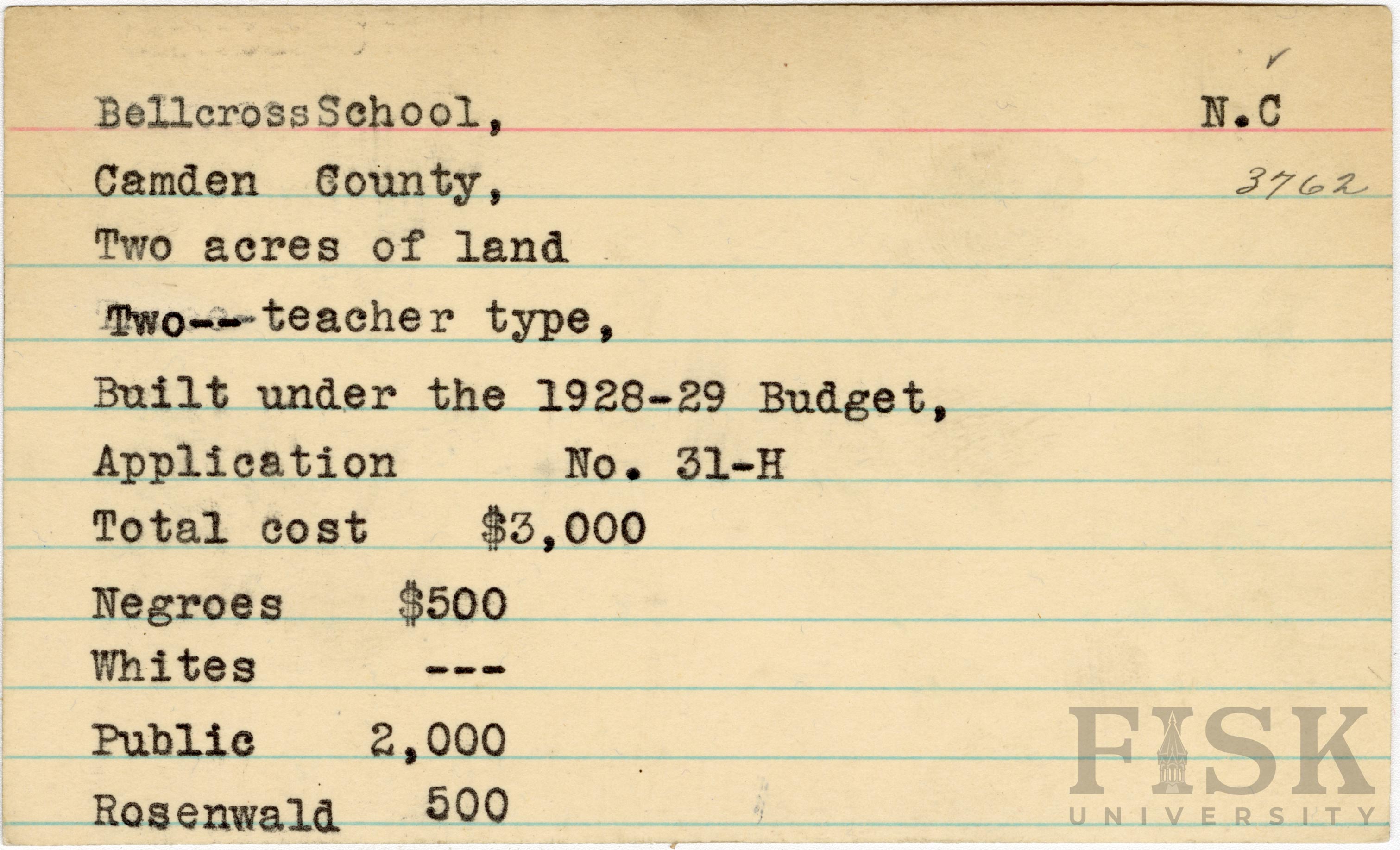 - Julius Rosenwald Fund--Buildings, African American schools--History--20th century, African American schools--Bellcross School