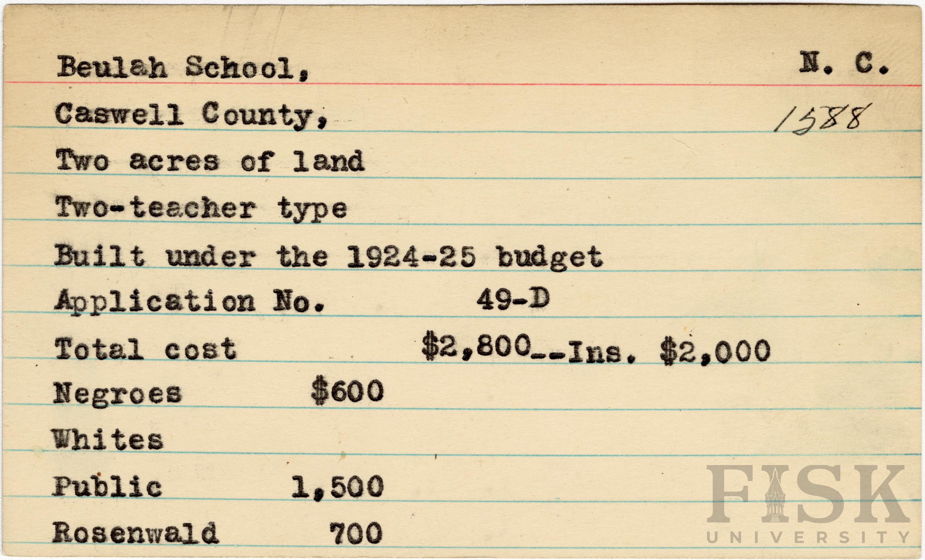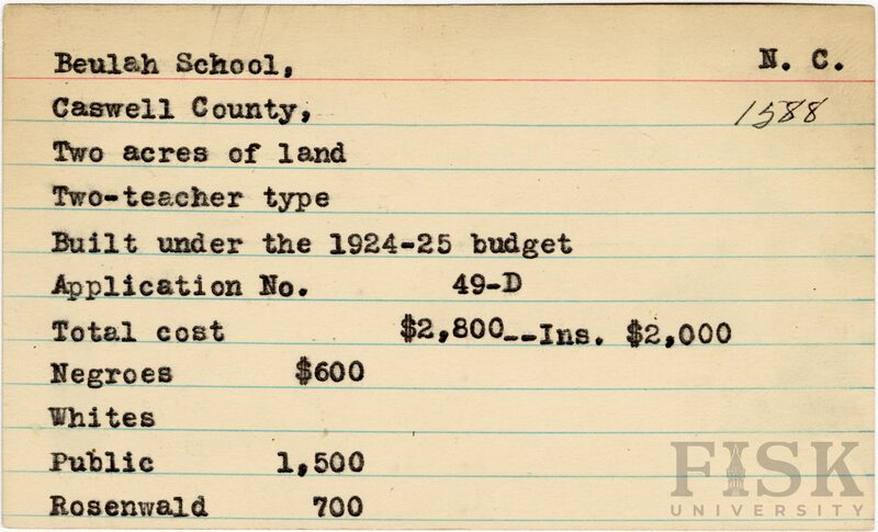 - Julius Rosenwald Fund--Buildings, African American schools--History--20th century, African American schools--Beulah School