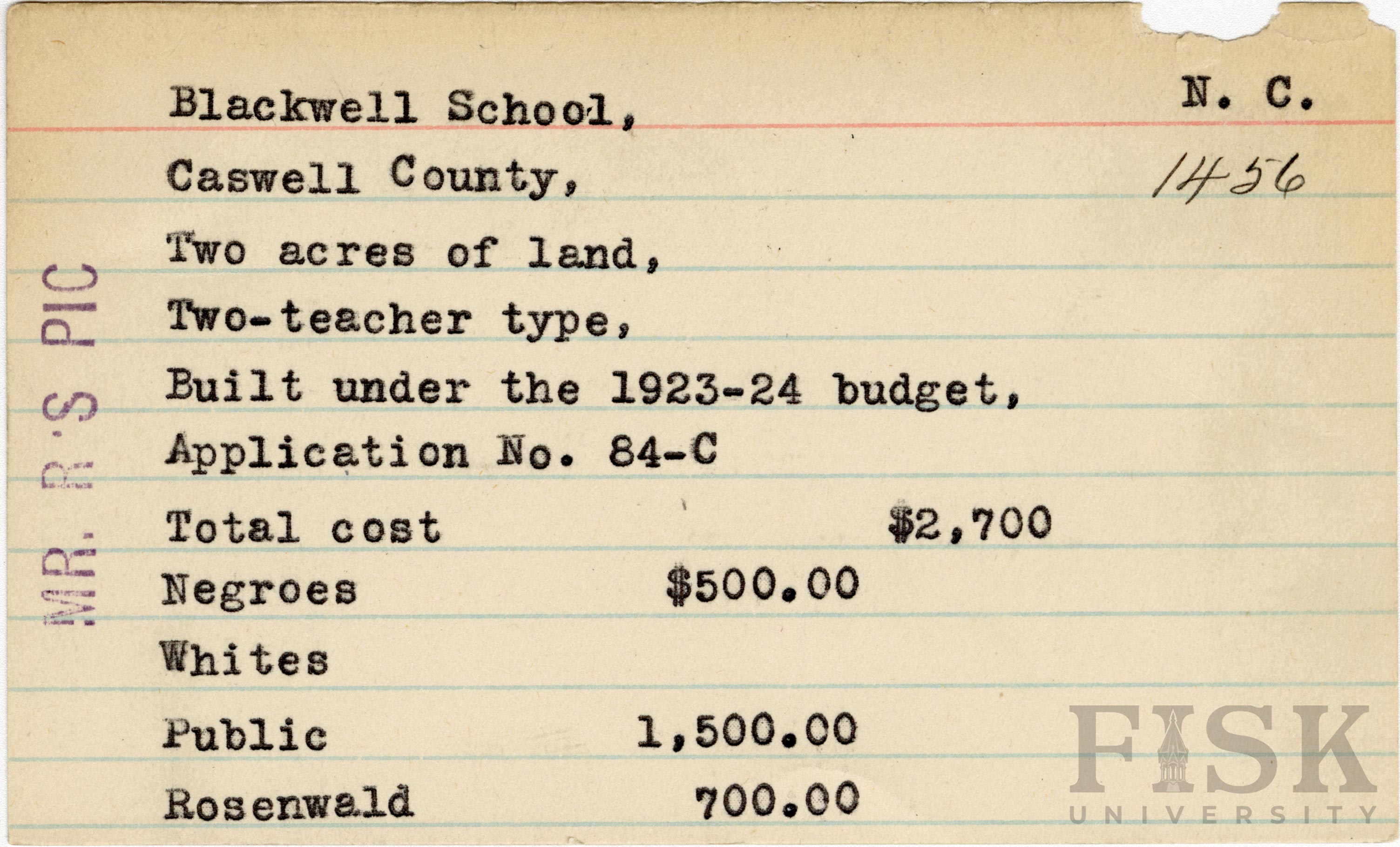 School card for Blackwell School in Caswell County, North Carolina with a note on the far left of the card that says, "Mr. R's Pic"