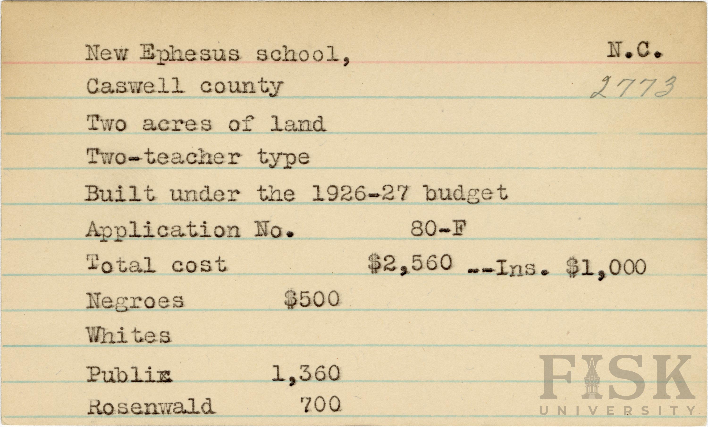 - School card for New Ephesus School in Caswell County, North Carolina with a section added to the budget contributions that says, "Ins. $1,000"