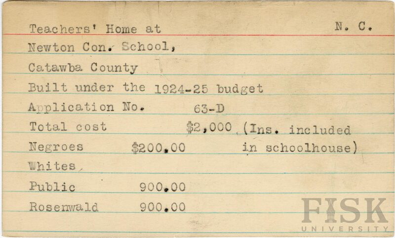 - School card for the teacher's home at Newton Consolidated School in Catawba County, North Carolina with a note next to the total cost of budget contributions that says, "(Ins. Included in schoolhouse)"