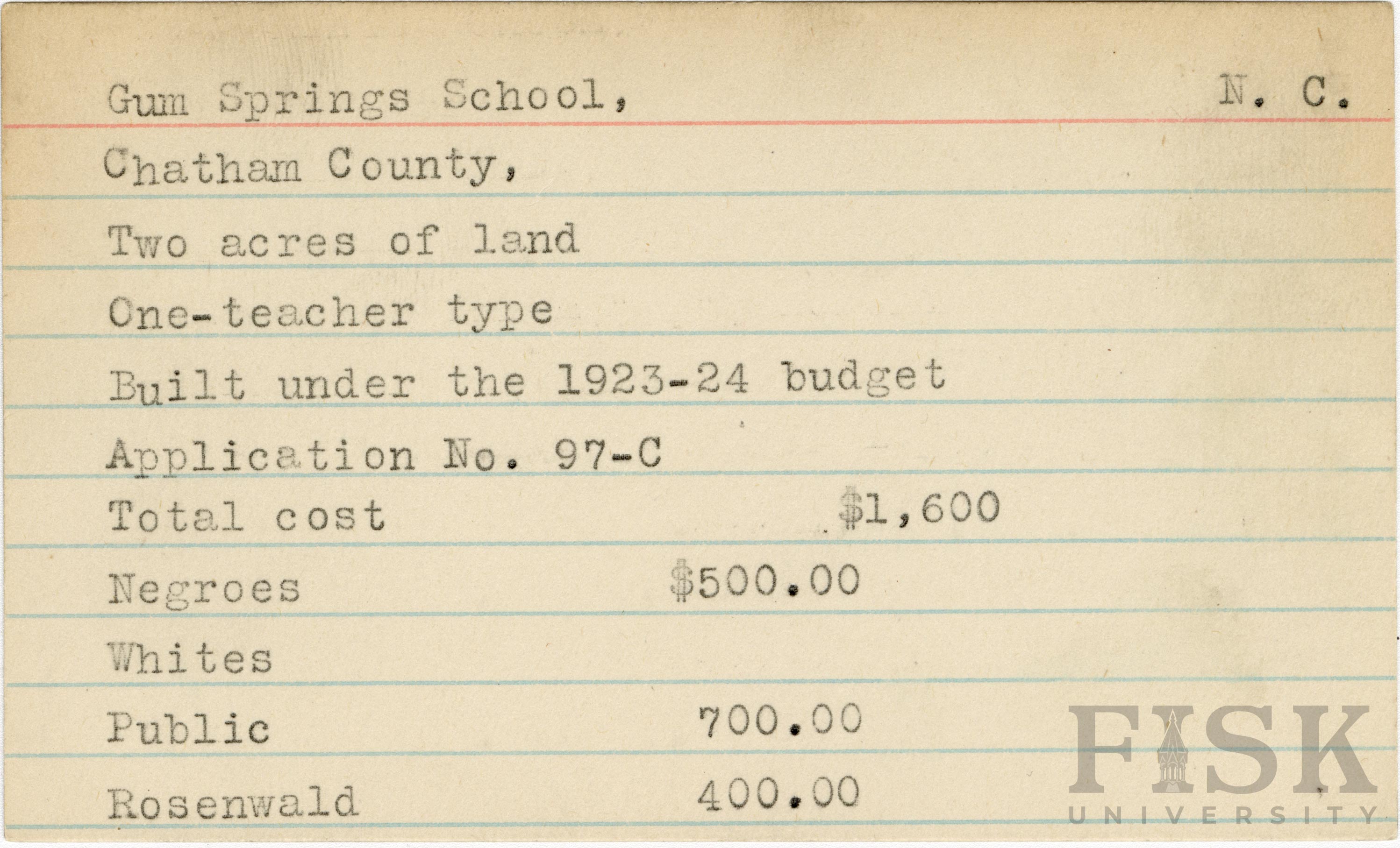 - Julius Rosenwald Fund--Buildings, African American schools--History--20th century, African American schools--Gum Springs School