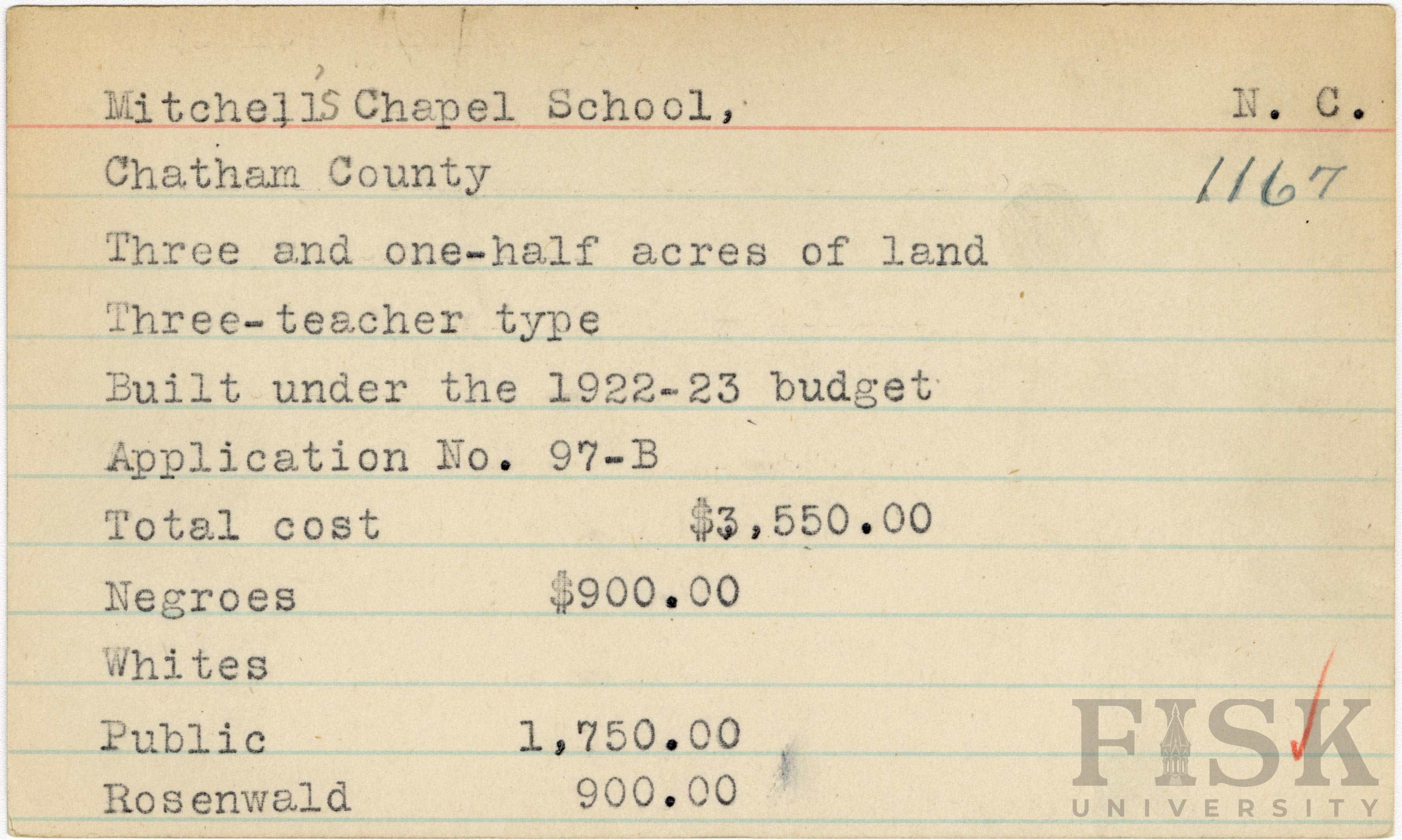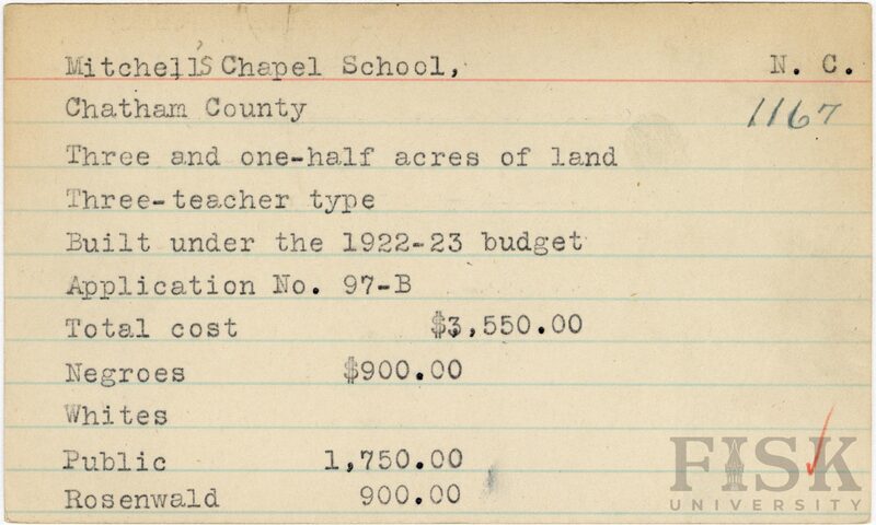 - School card for Mitchell's Chapel School in Chatham County, North Carolina