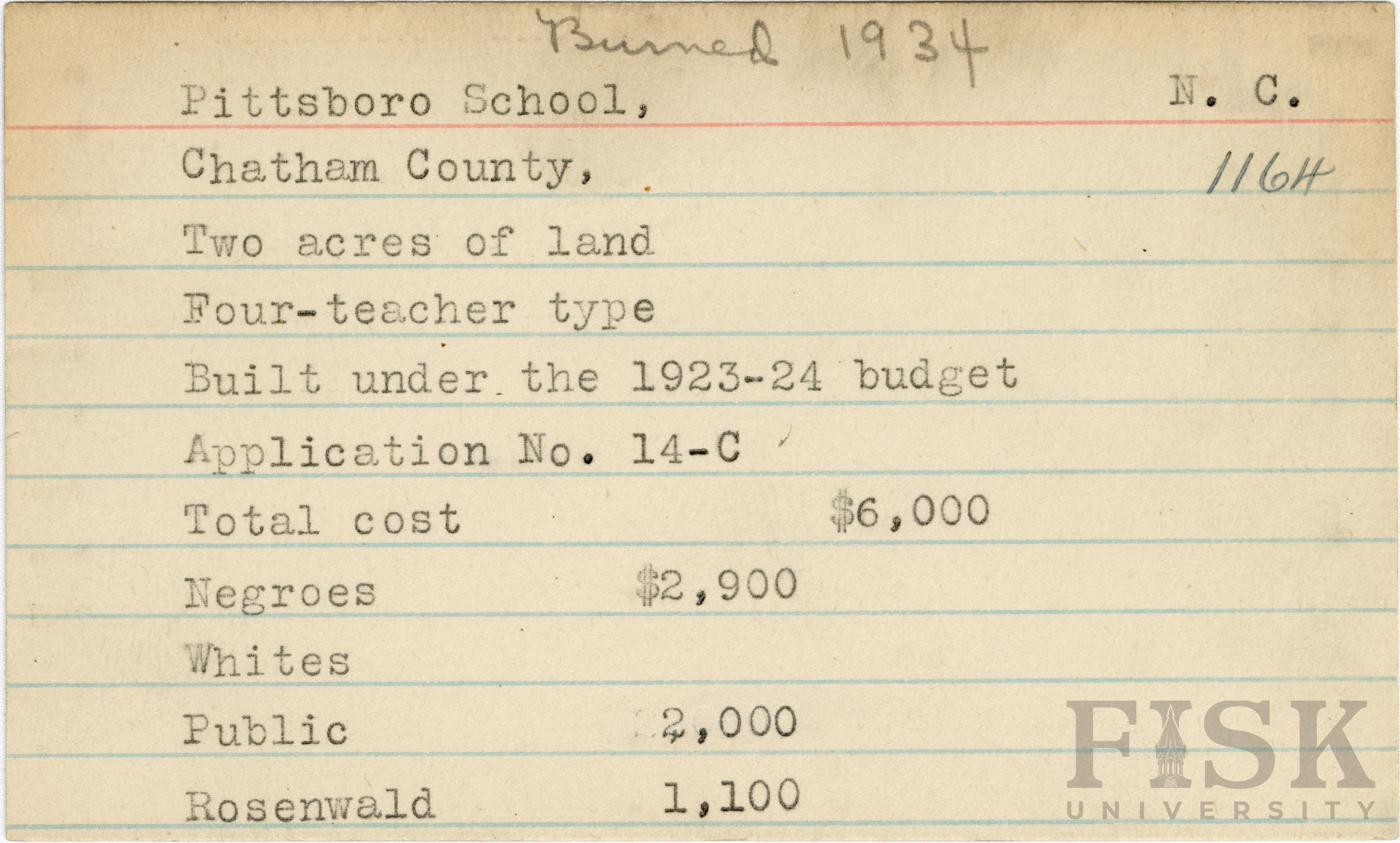 School card for Pittsboro School in Chatham County, North Carolina with a handwritten note on the top of the card that says, "Burned 1934"