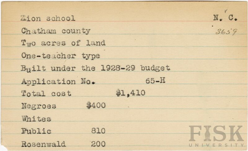 - School card for Zion School in Chatham County, North Carolina