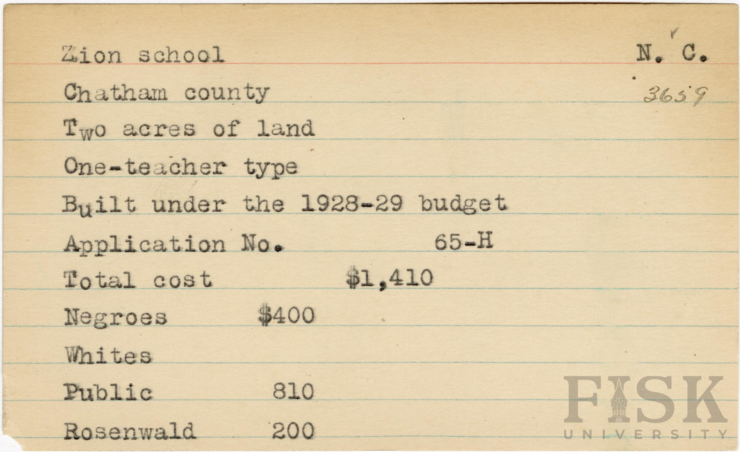 School card for Zion School in Chatham County, North Carolina