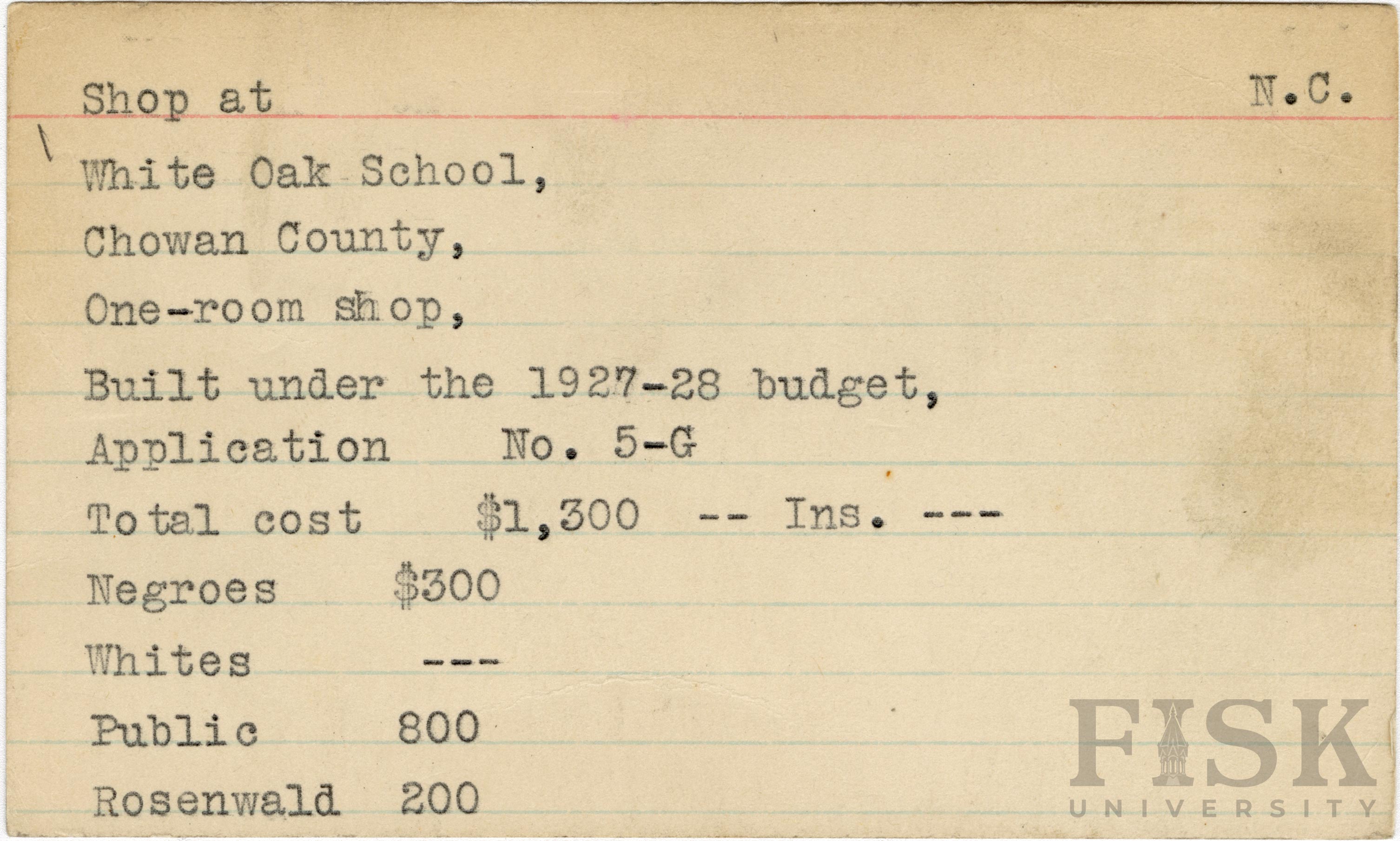 - School card for the one room shop at White Oak School in Chowan County, North Carolina