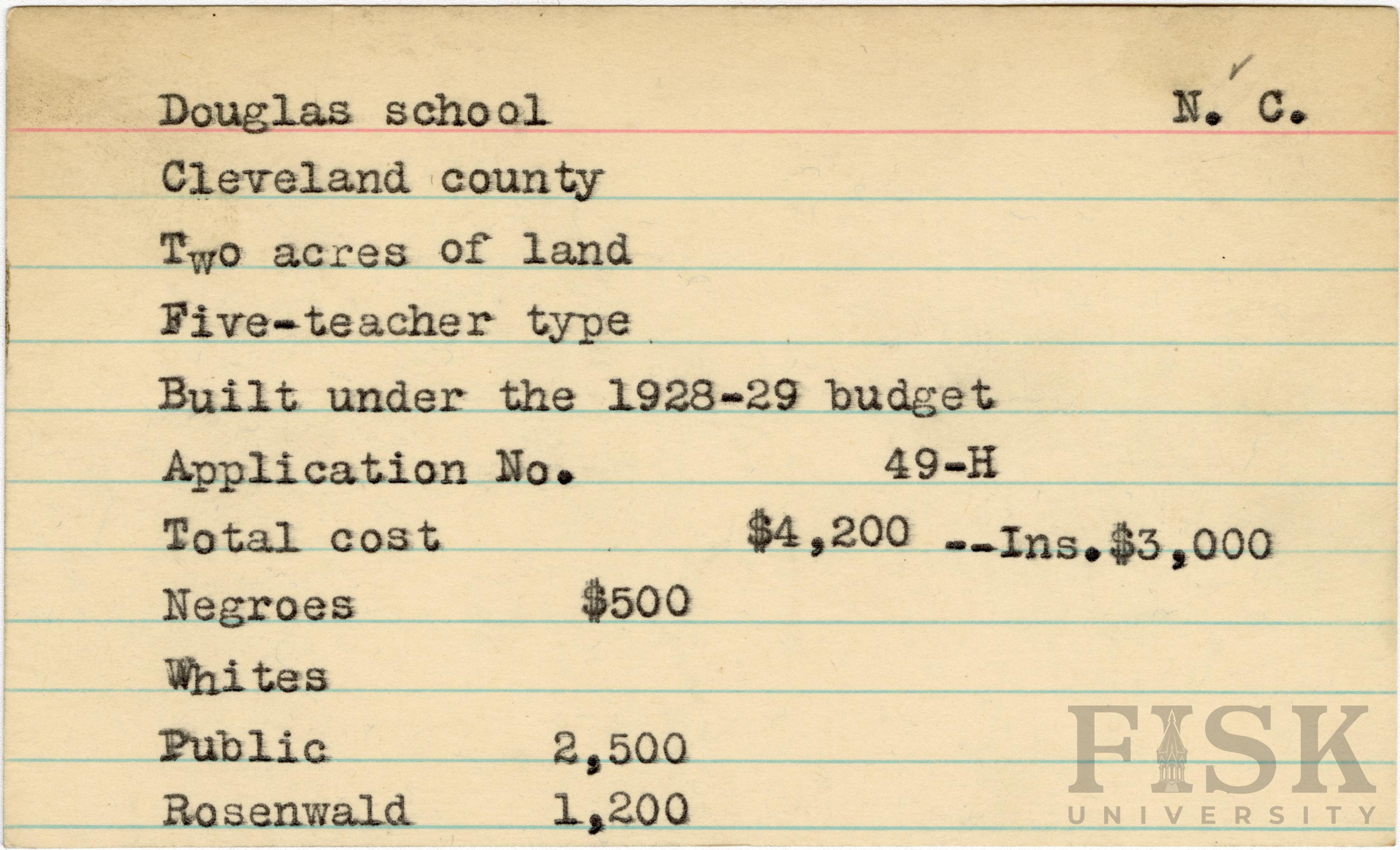 - School card for Douglas School in Cleveland County, North Carolina with a section added to the budget contributions that says, "Ins. $3,000"